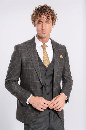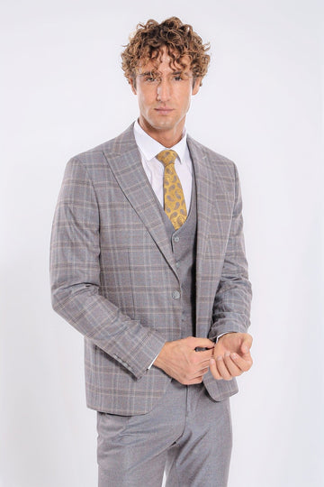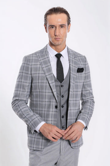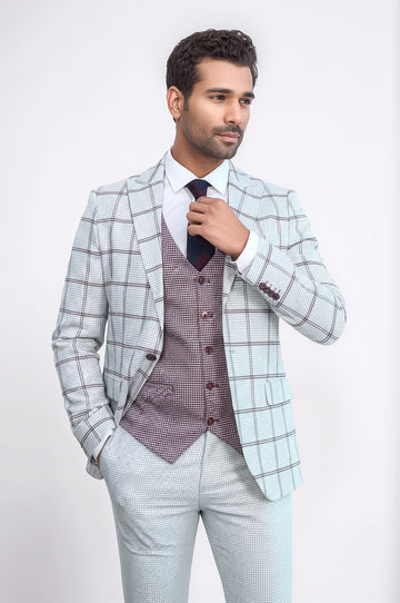 The plaid suit jacket serves as the centerpiece of patterned formal presentation, requiring expert pattern execution and superior construction to ensure sophisticated impact and appropriate formal appeal.