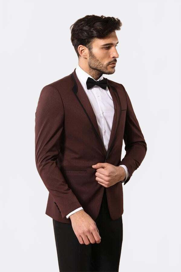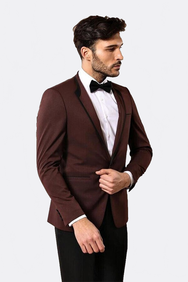 This groom suit consists of two parts, the jacket and the pants. The patterned jacket, which is very stylish with burgundy color, is designed using polyviscose fabric. This jacket with a shawl collar has a thin black stripe on the collar. This one-button jacket has three pockets and double slits. It is combined with comfortable black trousers with a plain black color for a complete formal look.