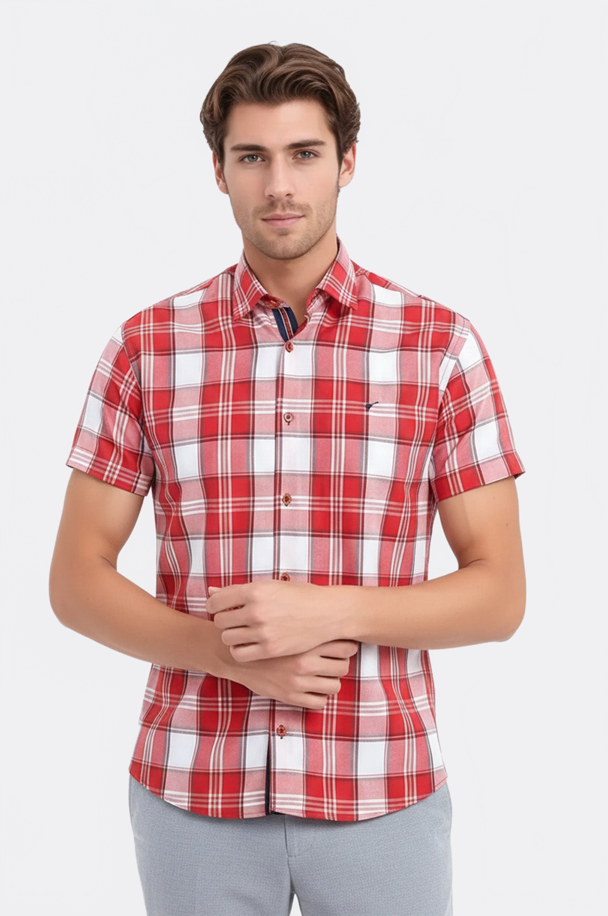 This short-sleeved men's shirt model, in which two striking elements in clothing, plaid and red, are used together, attracts confident gentlemen. With its slimfit fit and short sleeves of appropriate length, it deserves to be at the center of the collections of men who are confident in themselves and their bodies. You can blend this shirt model, which is extremely suitable for daily use, with jeans or canvas pants models. It can also be worn with capri pants and shorts.