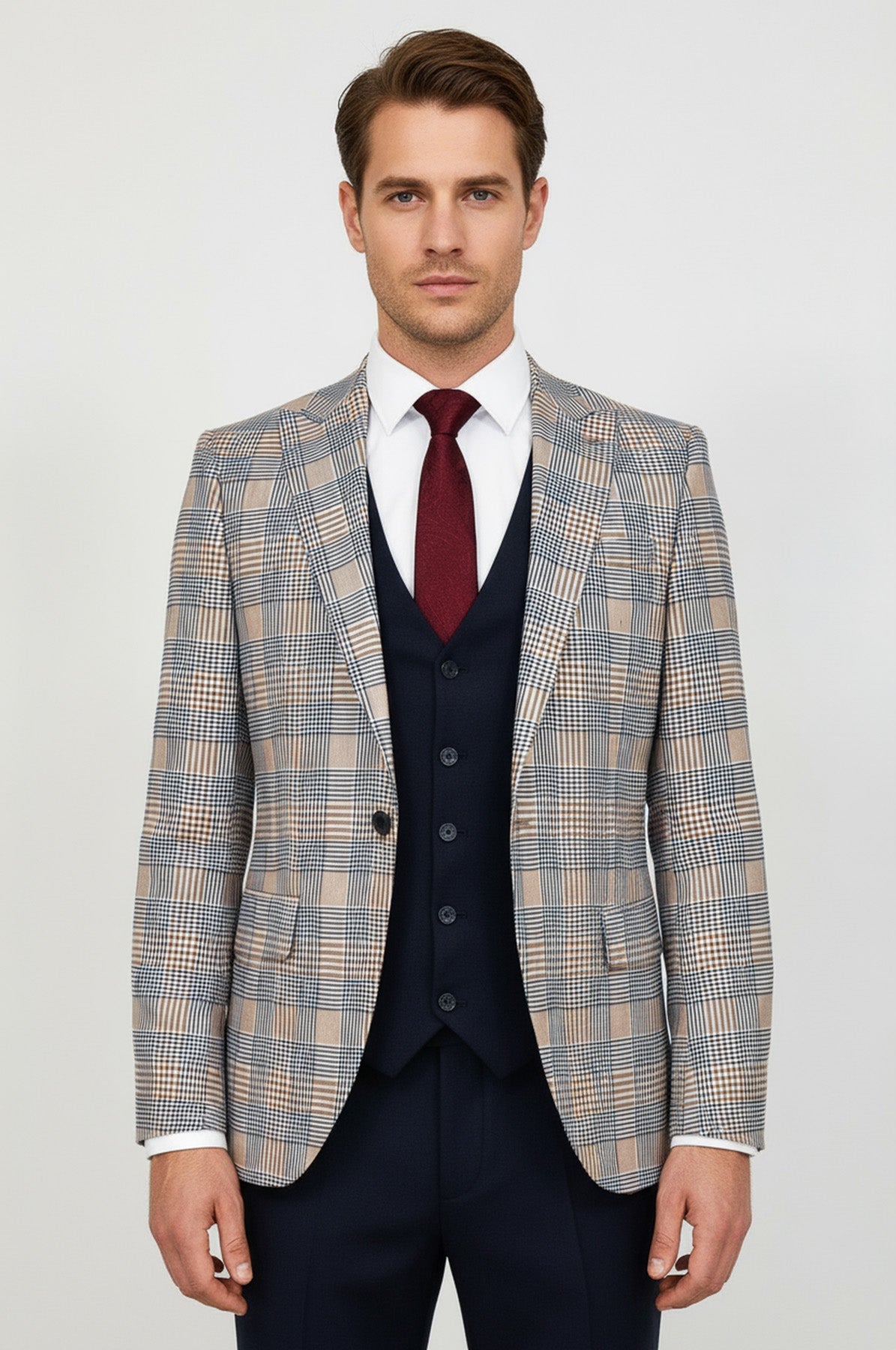 - Pattern: Checked Blazer with Plain Vest & Pants - Unique plaid pattern