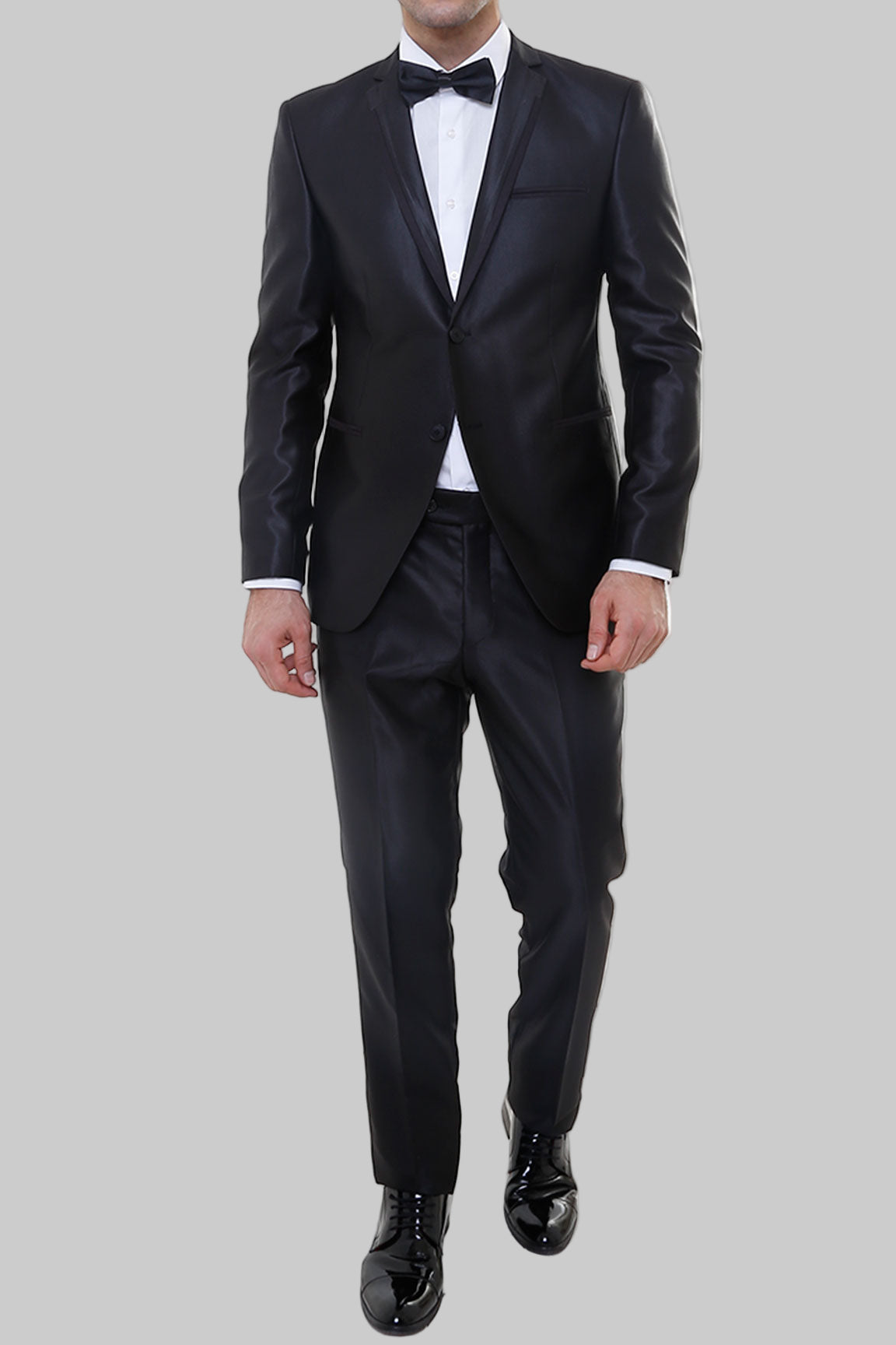 تتكون البدلة الرسمية المكونة من قطعتين من؛ سترة وسروال طية صدر السترة أحادية. مصممة بقماش عادي باللون الأسود.الملاءمة: مقاس نحيف