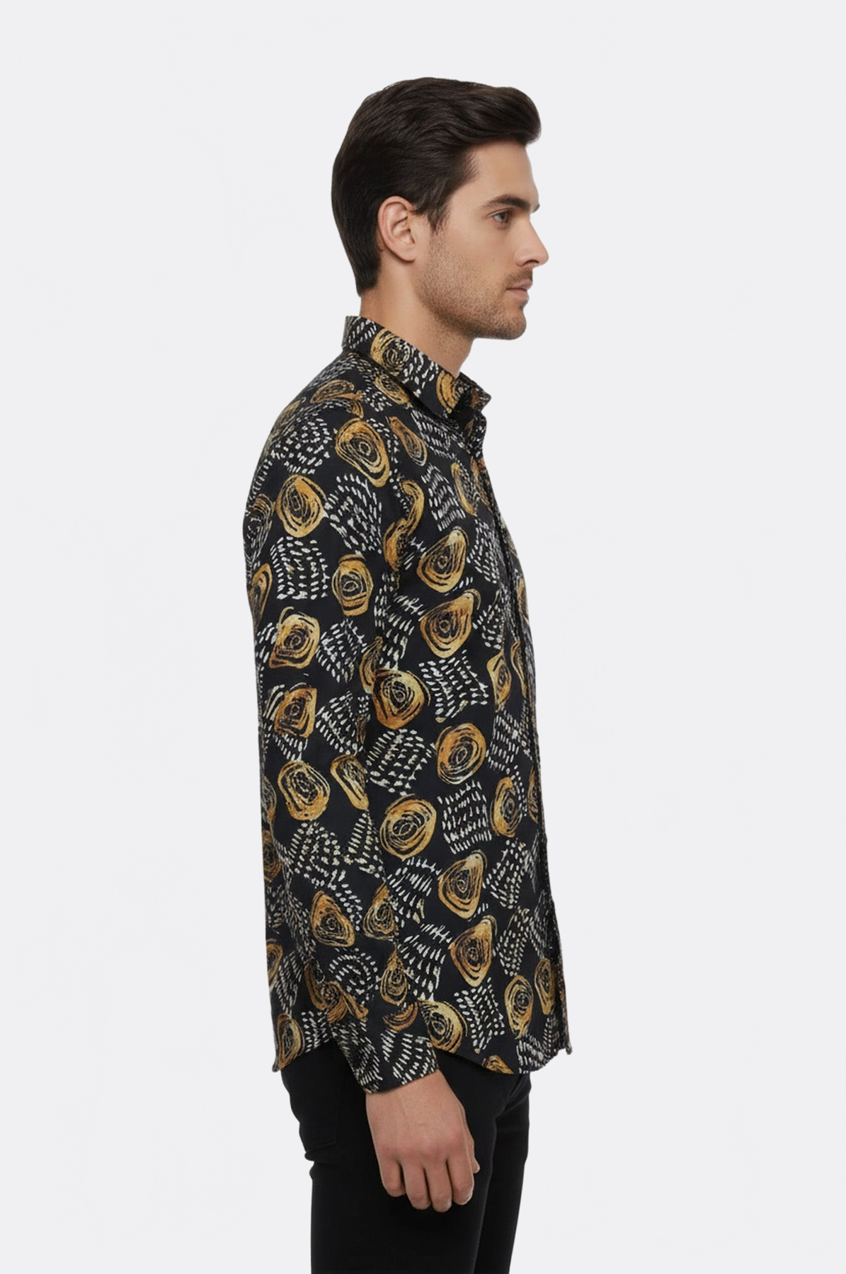 قميص رجالي أسود بقصة ضيقة وأكمام طويلة منقوشة بالزهور - ويسي