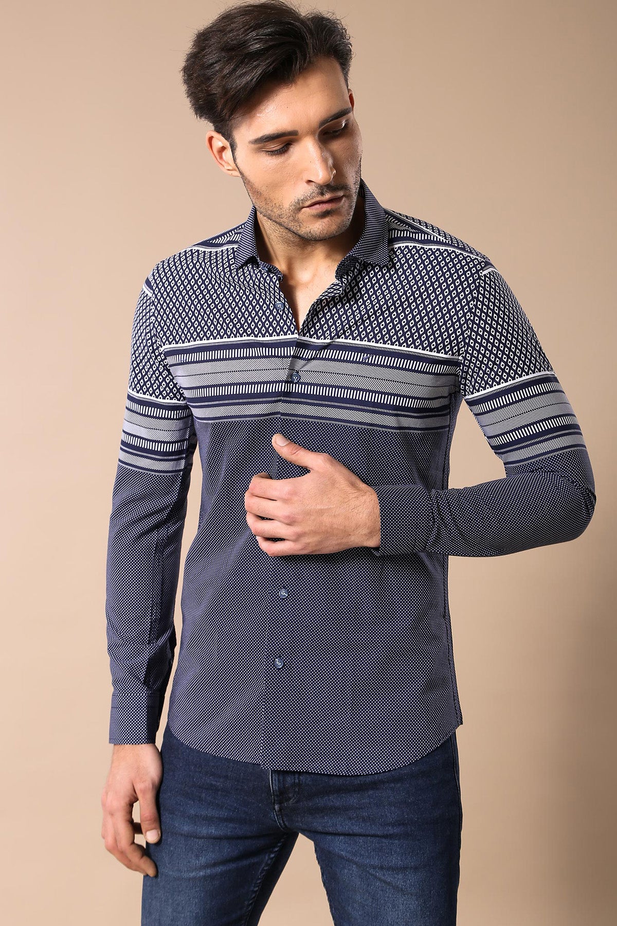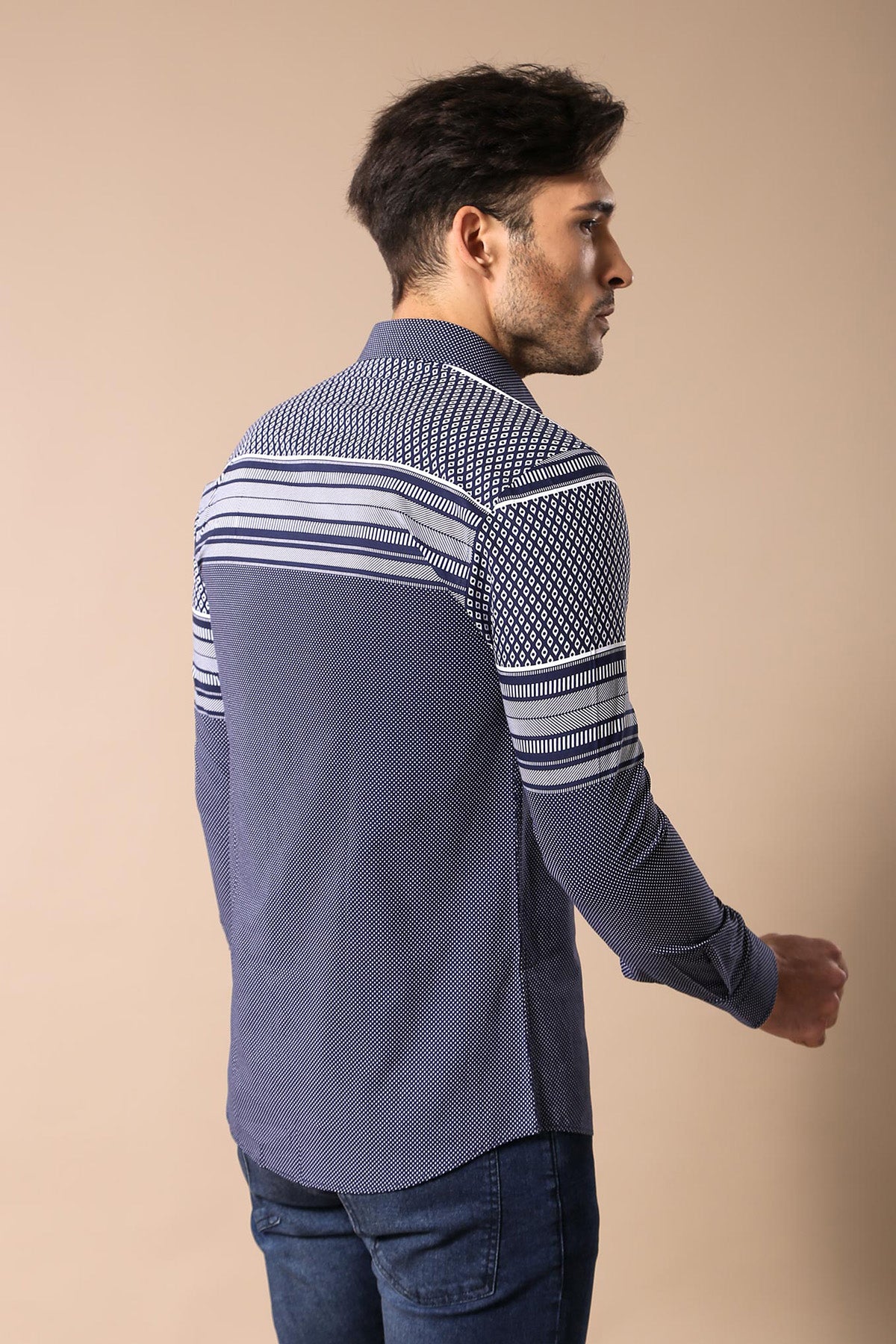 قميص رجالي منقوش باللون الأزرق الداكن - ويسي