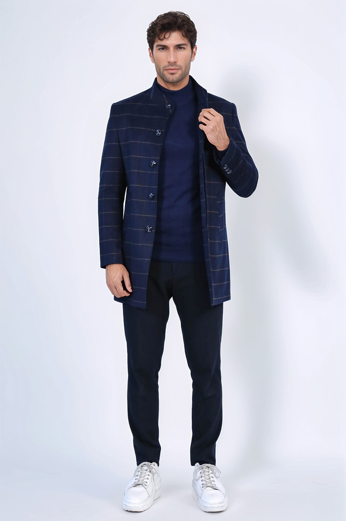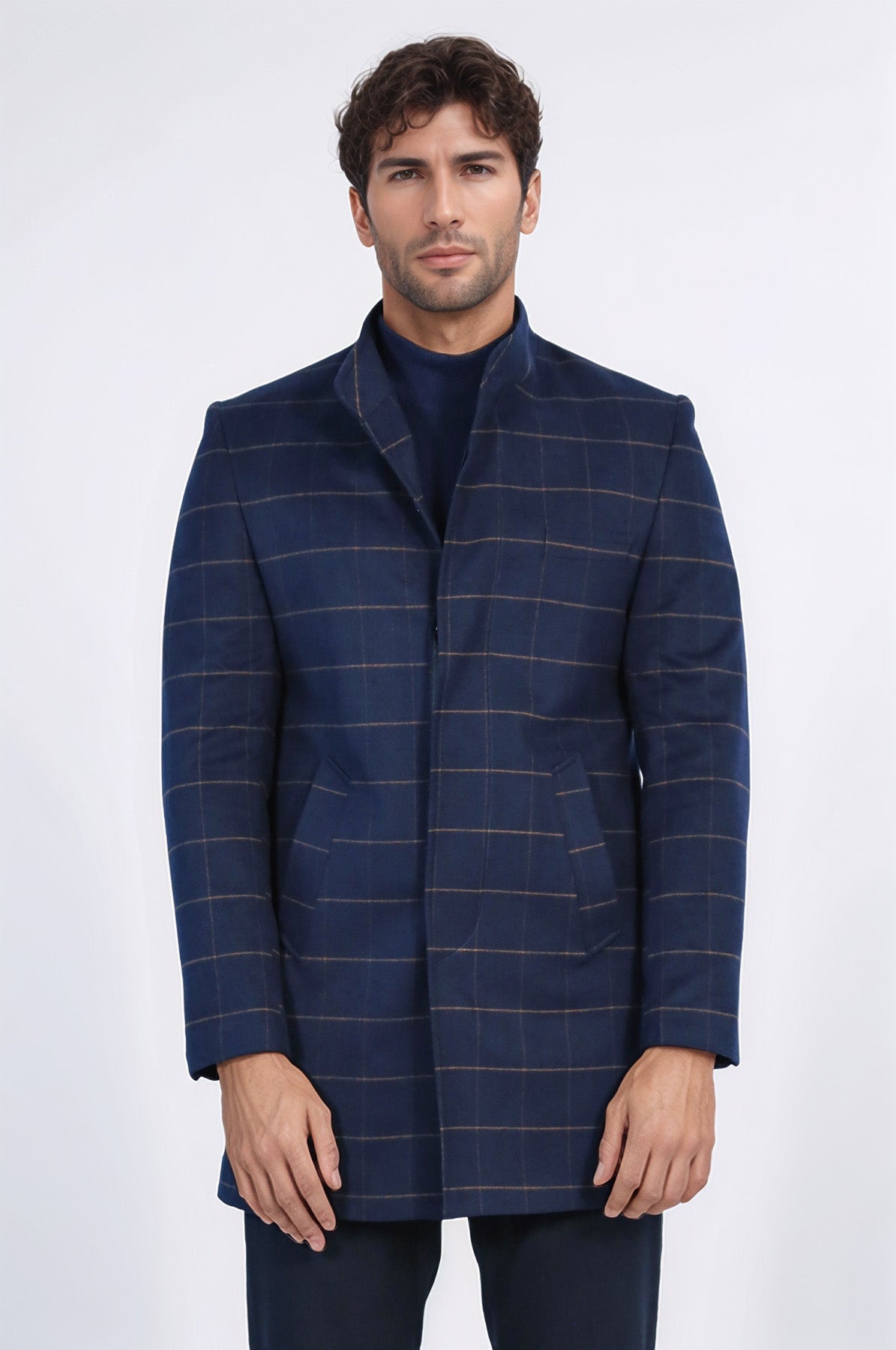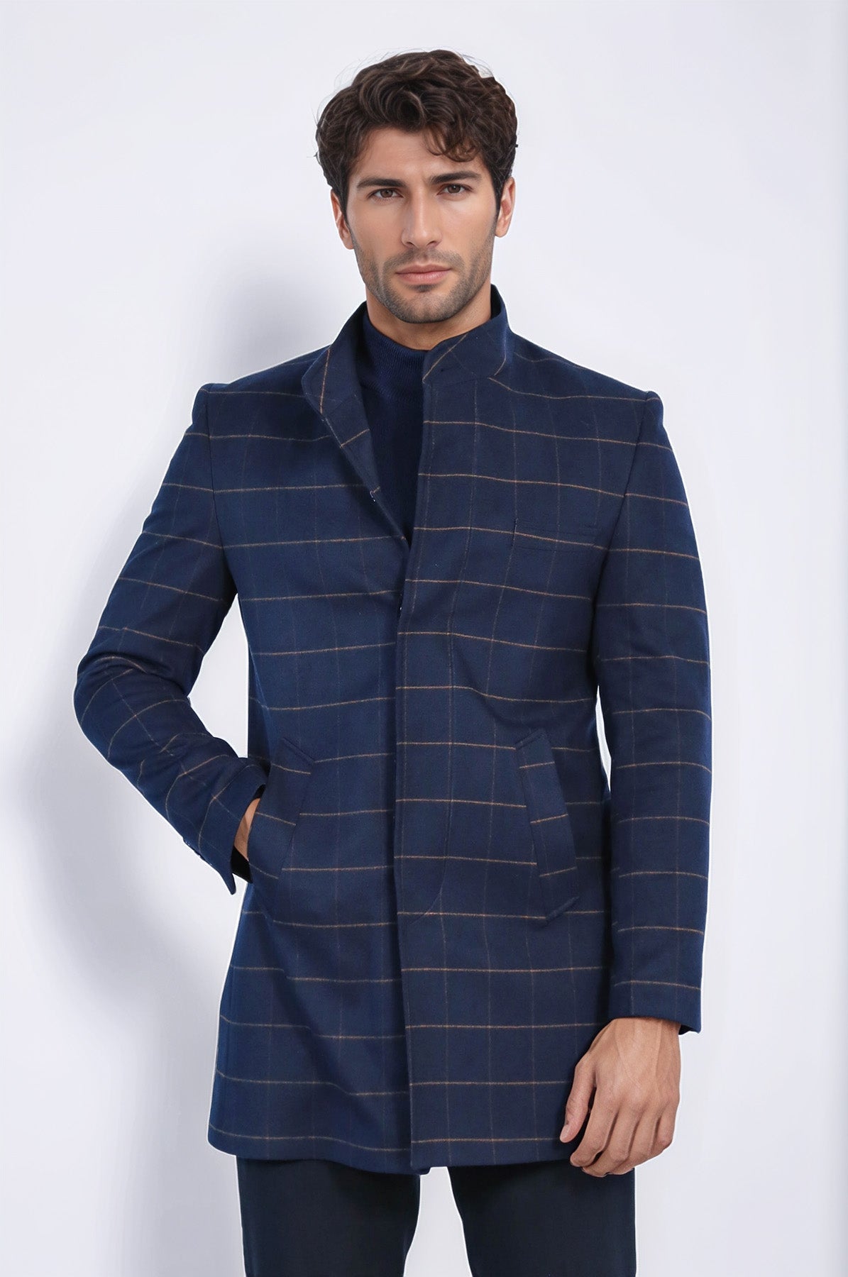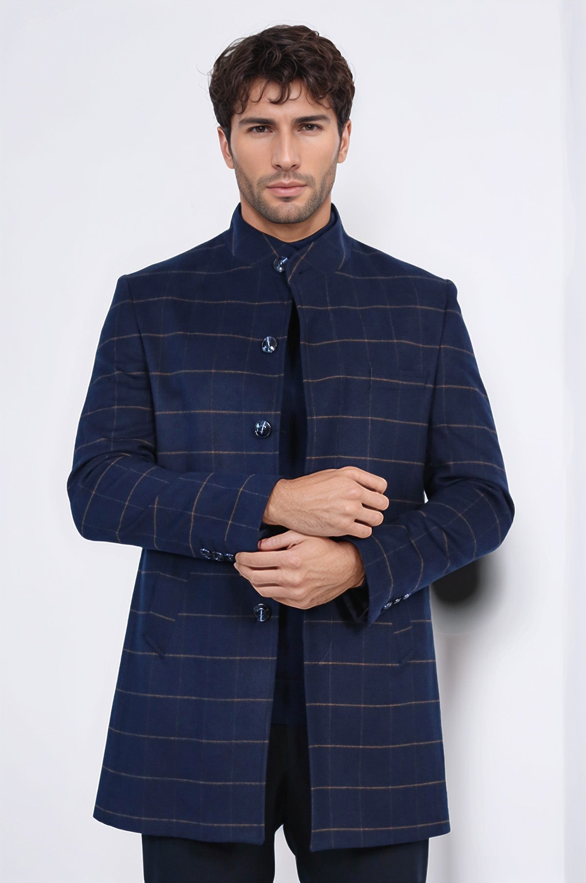منقوشة الوقوف طوق معطف الرجال الأزرق الداكن - ويسي