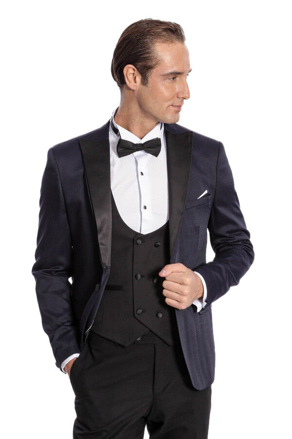 Patterned Combined Navy Blue Men Tuxedo - Wessi