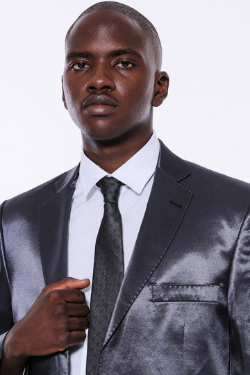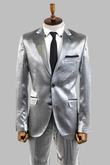 Silver grey suit selections bridge light and medium grey tones while providing sophisticated neutrality with distinctive metallic undertones that create elegant formal presence for special occasions and business events.