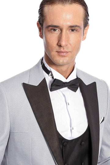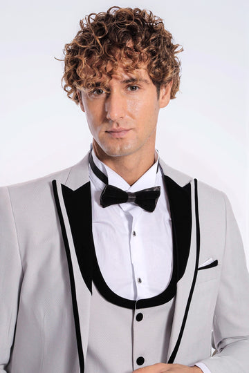 Light grey suit with bow tie formal applications provide classic elegance that works beautifully for black-tie optional events, formal celebrations, and occasions where traditional sophistication is desired and appreciated.