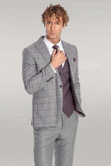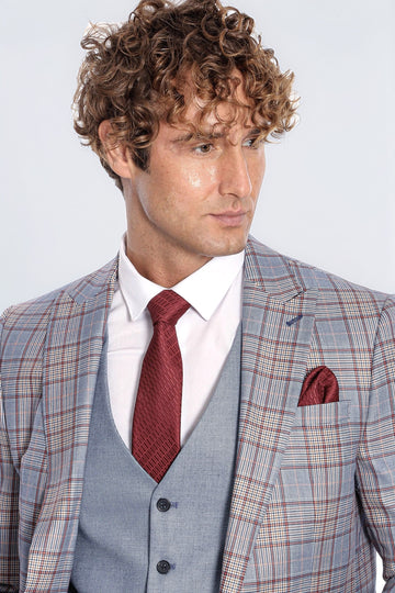 Light grey suit with burgundy shirt combinations create rich, sophisticated coordination that works excellently for autumn weddings and formal events where warm color harmony enhances seasonal appropriateness and elegant presentation.