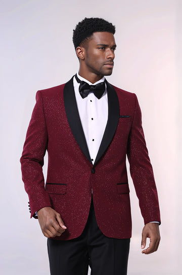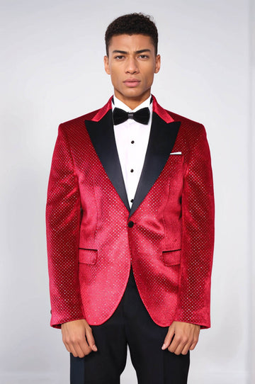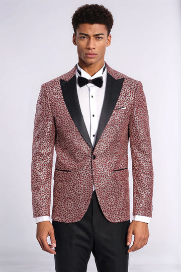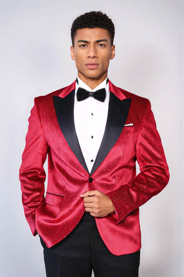 The red dinner jacket with black lapel design demonstrates how color can be incorporated into formal wear through thoughtful design elements that maintain elegance while adding personality to formal looks.
