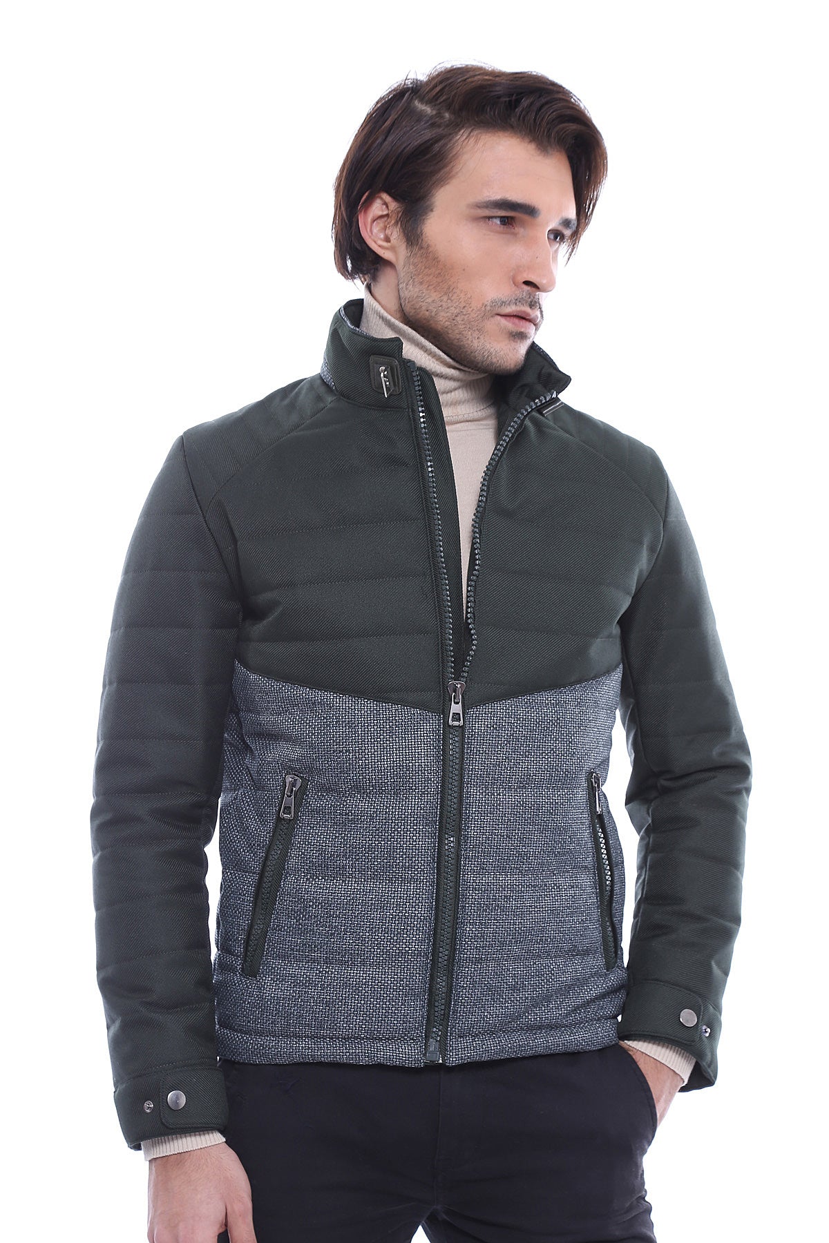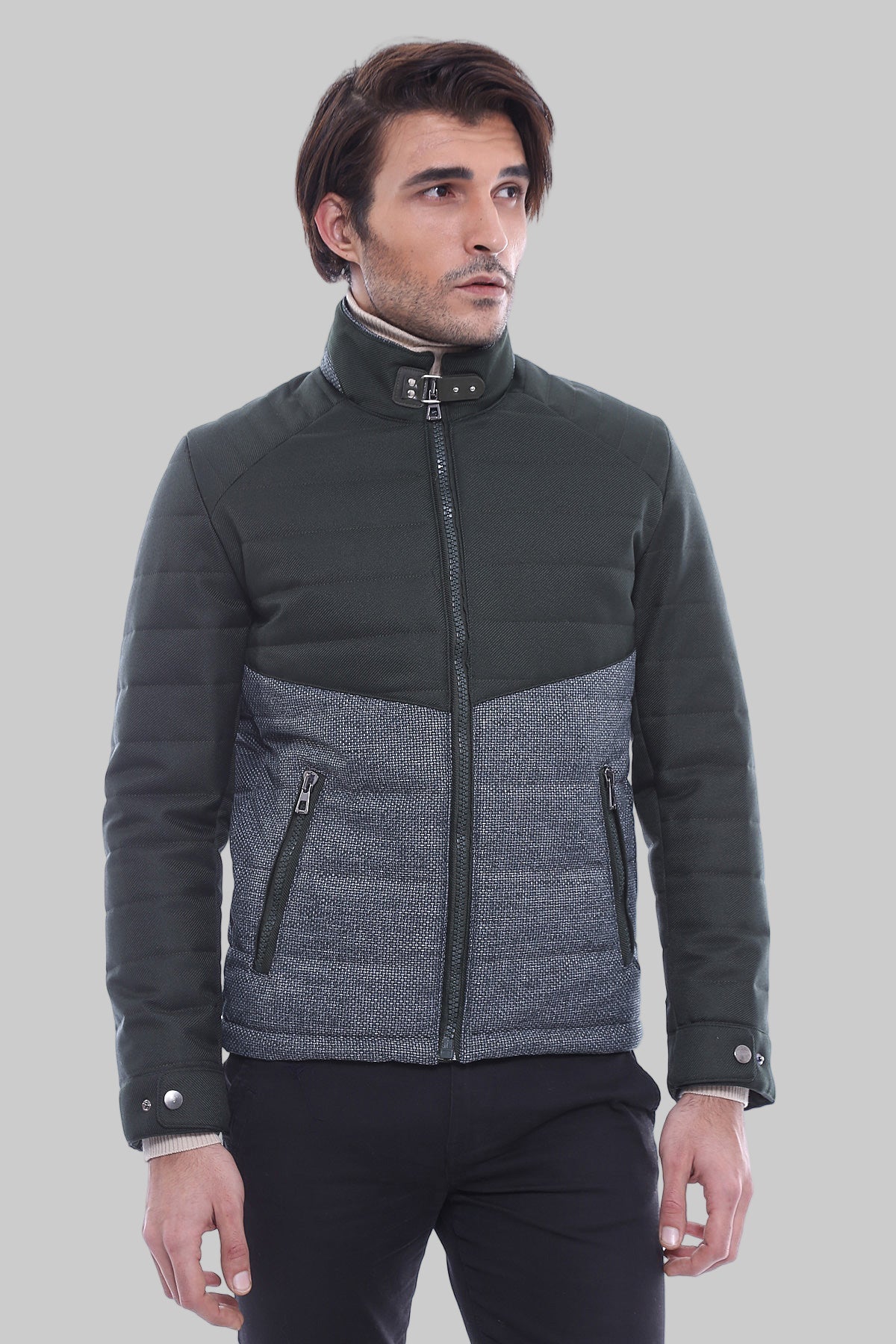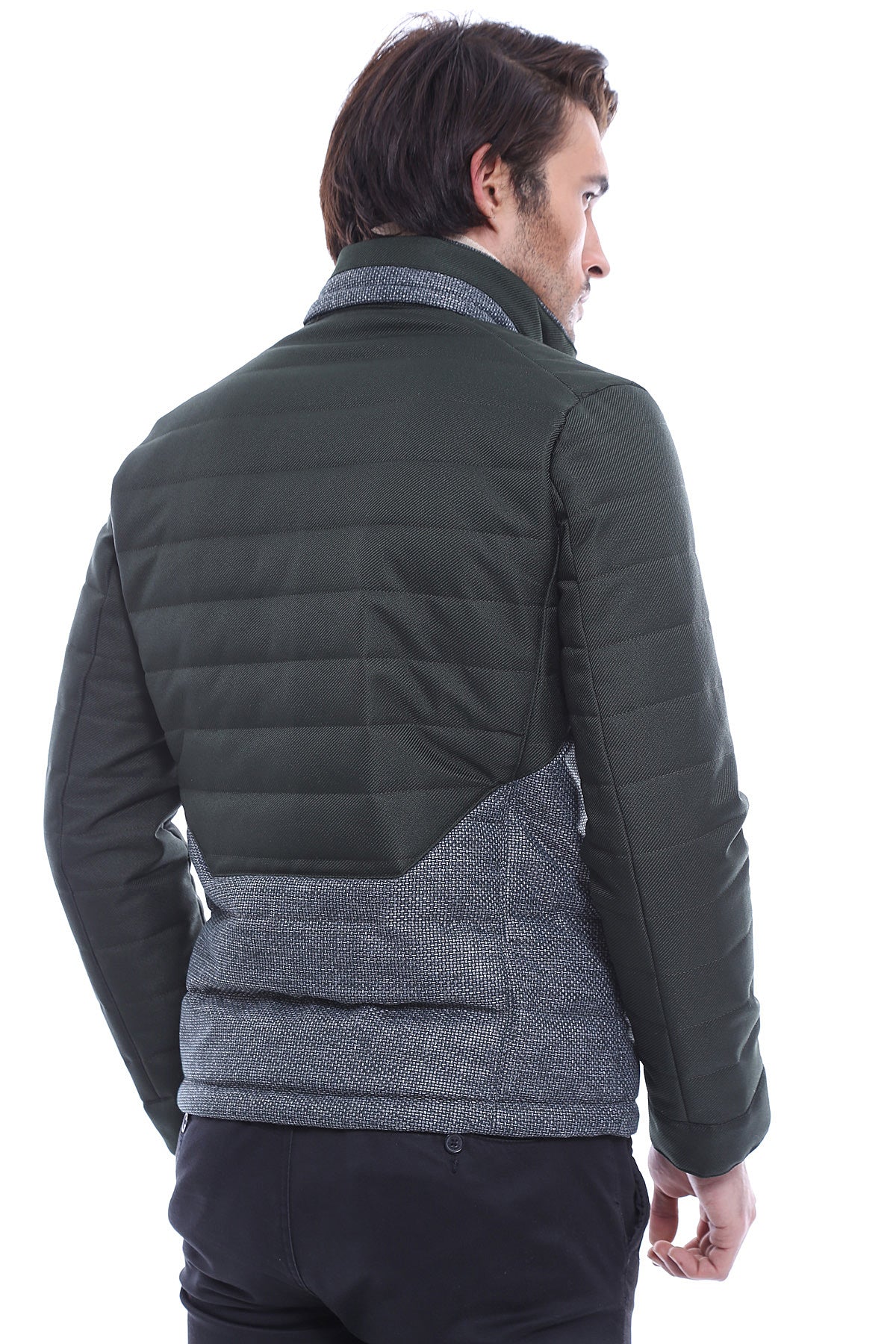 Uno de nuestros modelos de abrigos de abrigo para hombre es este abrigo hinchable con colores verde y gris combinados. Diseñado combinando tejido acolchado de invierno verde en la parte superior y gris en la parte inferior, este abrigo está preparado con un patrón de corte entallado. En los detalles del cuello del modelo sin aberturas vemos que se combinan tejidos verdes y grises. En el cuello del abrigo, que está diseñado como cuello vertical, también se utiliza como accesorio un accesorio con cierre de presión.