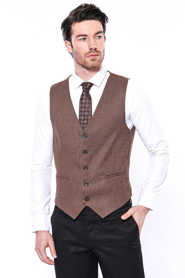 Manténgase abrigado y elegante con este chaleco marrón con cuello en V para hombre de Wessi. Confeccionado con materiales de alta calidad, este chaleco es perfecto para cualquier ocasión. Con su diseño de cuello en V, añade un toque de sofisticación a cualquier conjunto. Mejora tu guardarropa y mantente cómodo con Wessi.