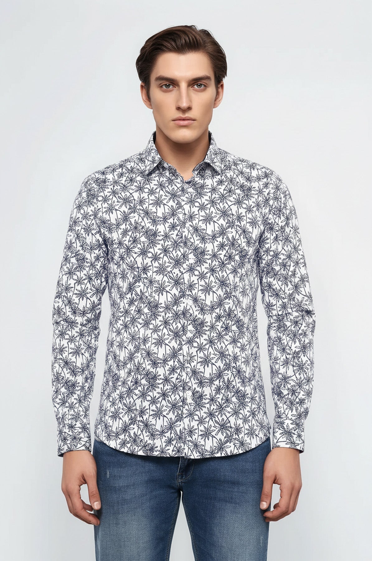 Avec son motif accrocheur, ce modèle de chemise pour hommes apparaît comme l'un de nos modèles de chemises qui plaisent aux goûts de nombreux clients. Vous pouvez refléter l'énergie chaude et chaleureuse du printemps dans votre style avec des motifs de fleurs, de branches et de feuilles dans des tons bleu foncé et bleu conçus sur un fond blanc. Ce modèle de chemise, qui se combine facilement avec un jean, vous permet également de créer les combinaisons les plus stylées et d'avoir un look stylé sans aucune difficulté.