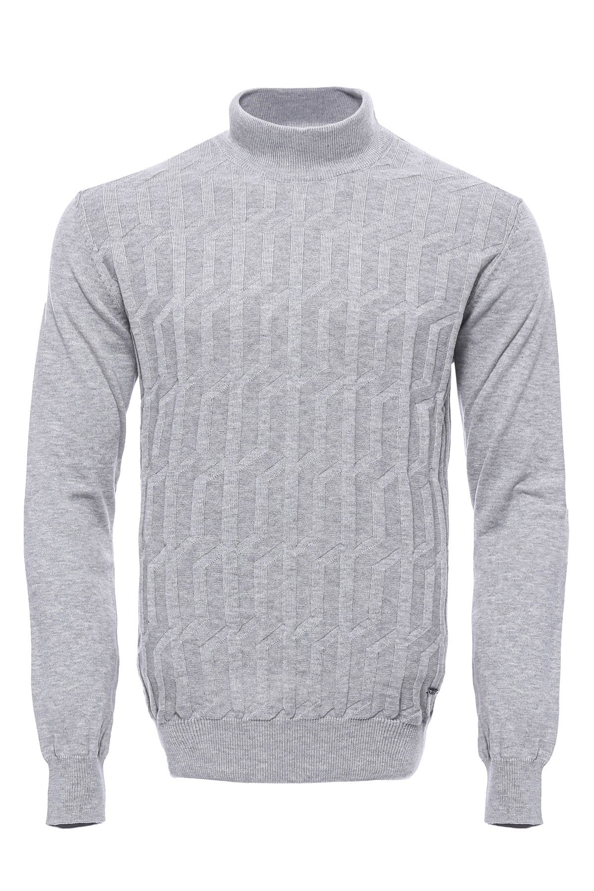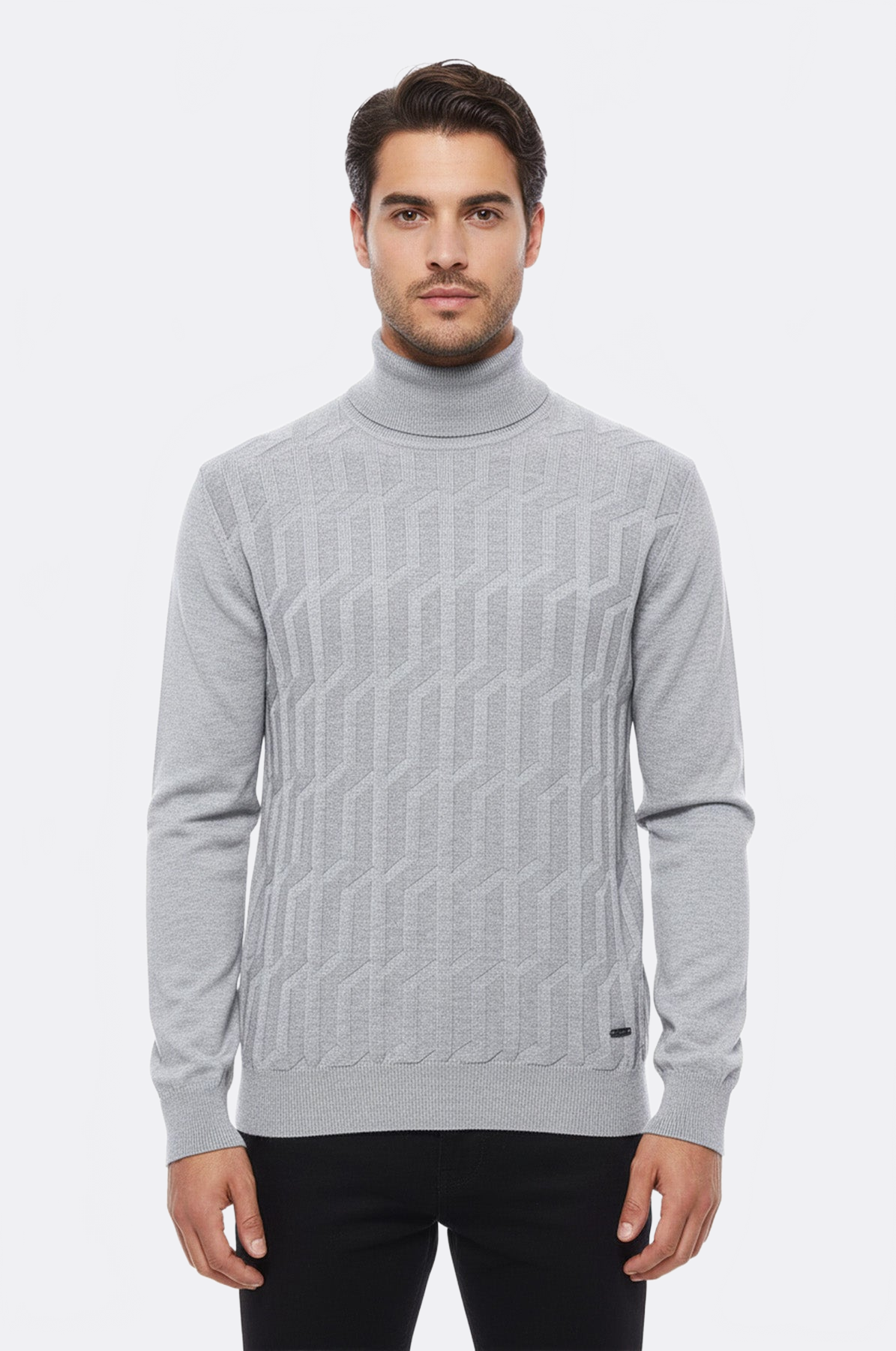Pull demi-col roulé pour homme, conçu avec un tissu à motifs gris.