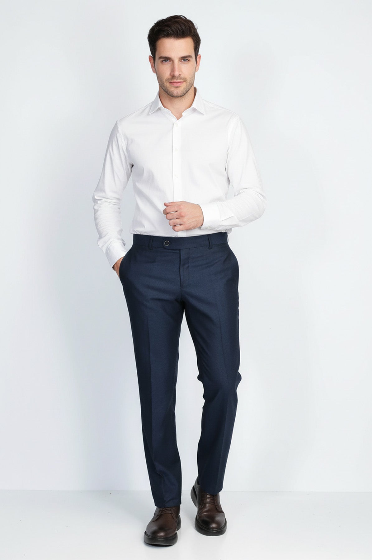 Sophisticated, elegant, and refined — Wessi's navy textured slim fit dress trousers deliver contemporary elegance with expert tailoring. These premium trousers feature a rich navy color with distinctive textured fabric, refined slim fit silhouette, and modern design that creates a sleek and polished appearance, perfect for business meetings, casual business settings, smart casual occasions, formal events, office wear, weekend outings, and making a powerful statement with contemporary sophistication.