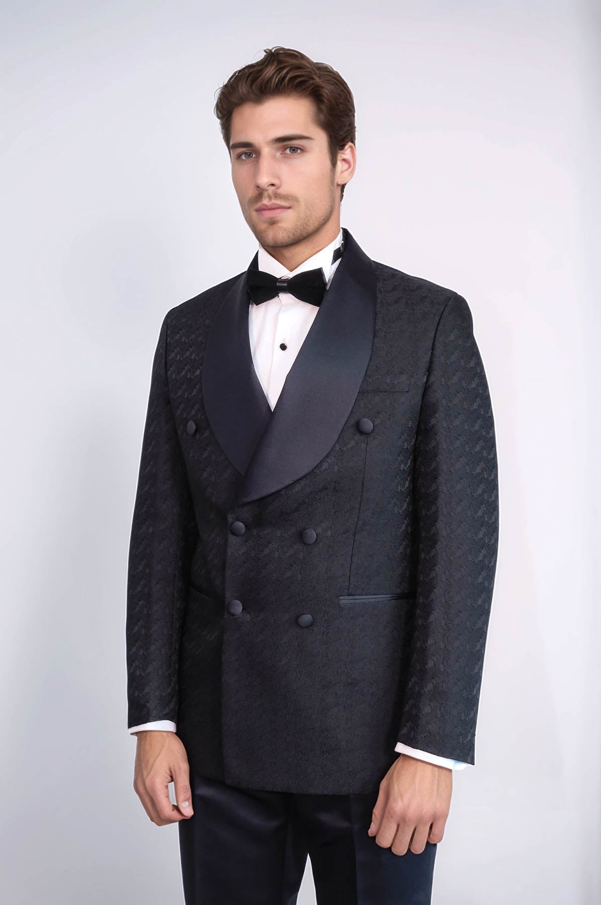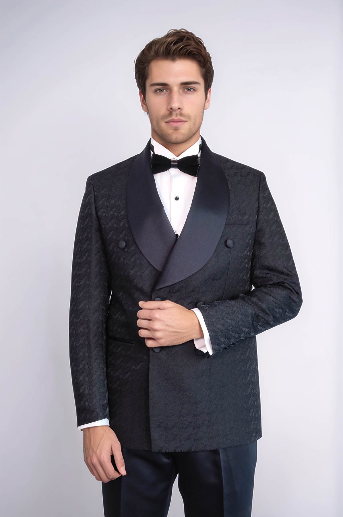 Élevez votre tenue formelle avec le costume de smoking noir à double boutonnage à motifs et col châle en satin de Wessi. Fabriqué avec des matériaux de haute qualité, ce costume possède un col châle classique et un design à double boutonnage pour un look sophistiqué. Parfait pour tout événement formel, ce costume respire la confiance et le style.