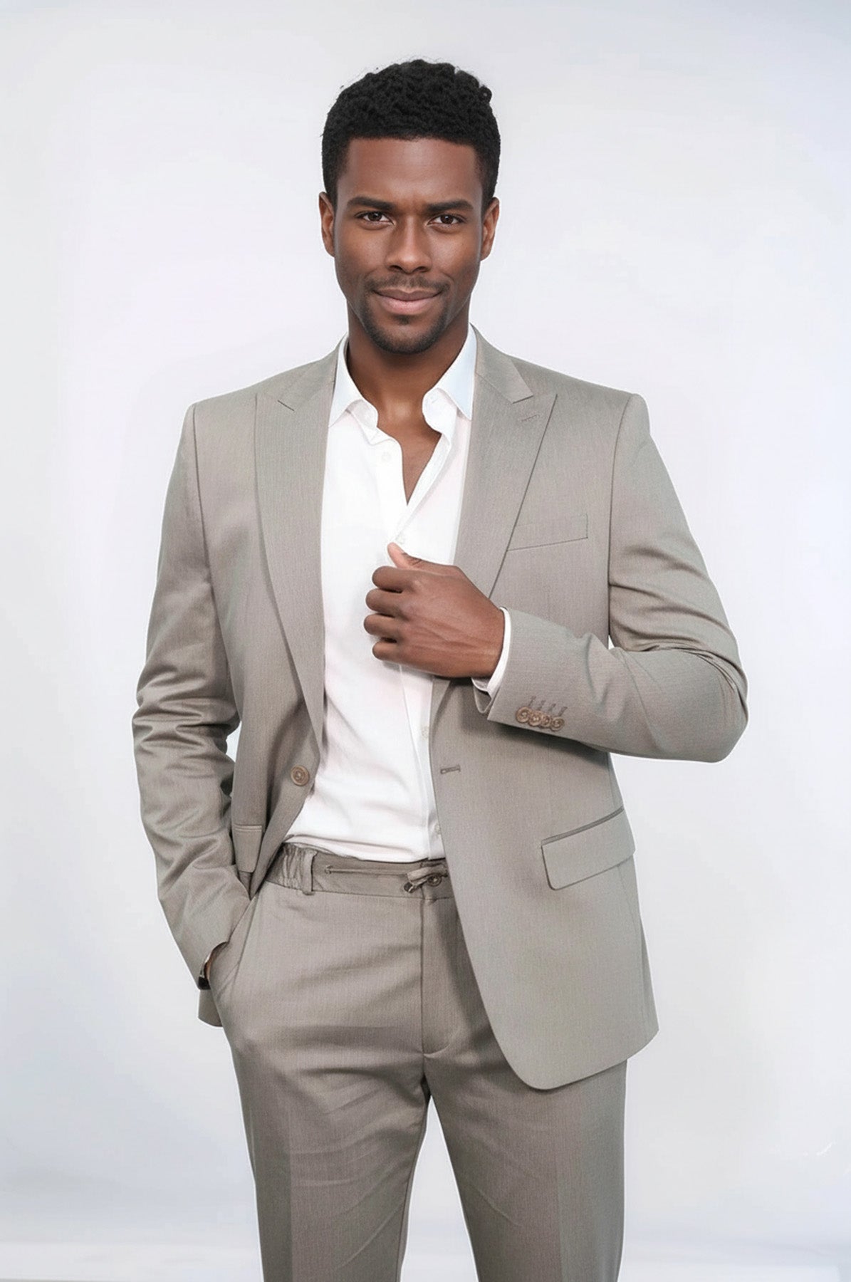 ❓ What style does this light grey suit offer?