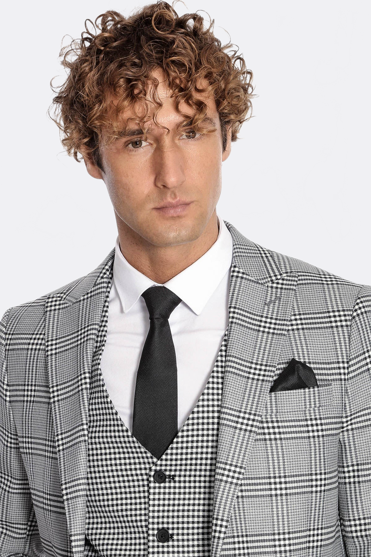 Modèle : Blazer à carreaux, pantalon à motifs, gilet à carreaux