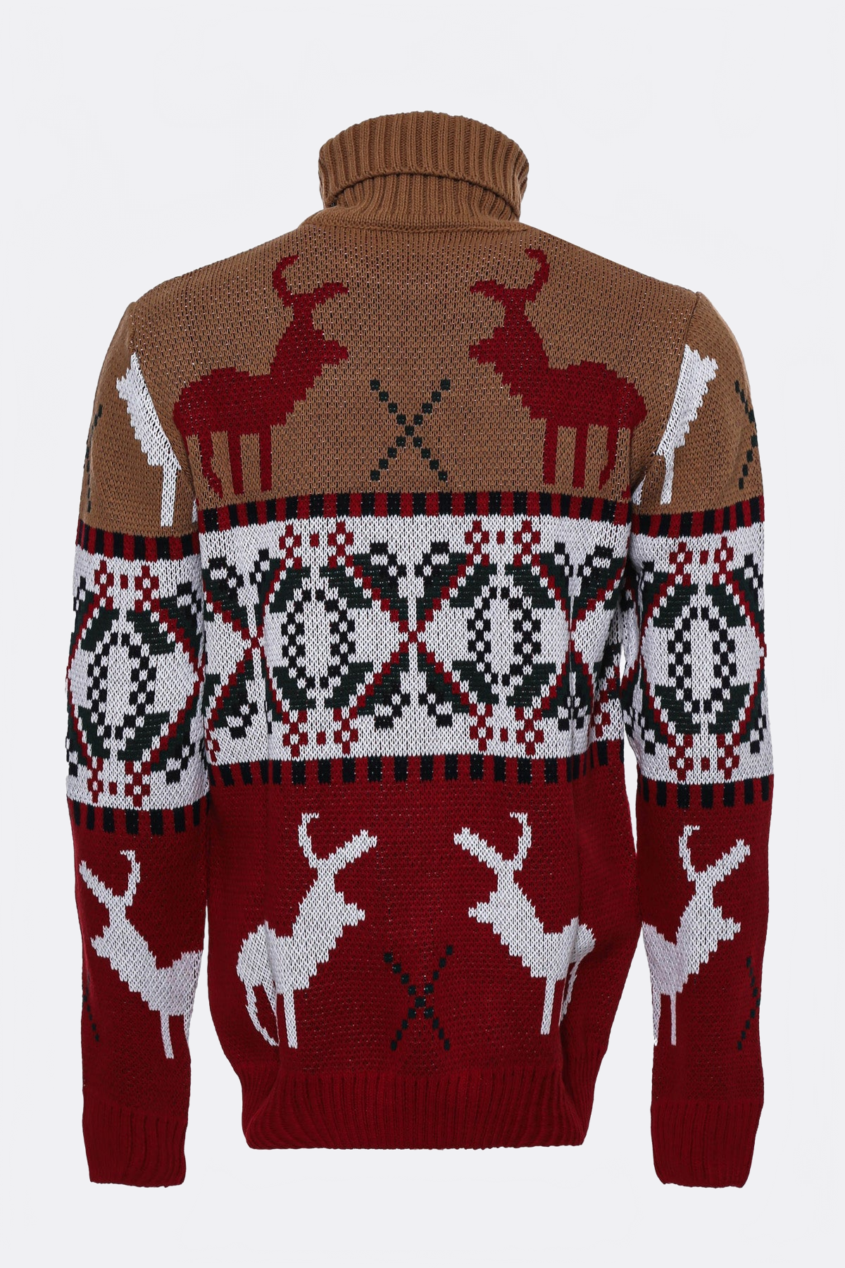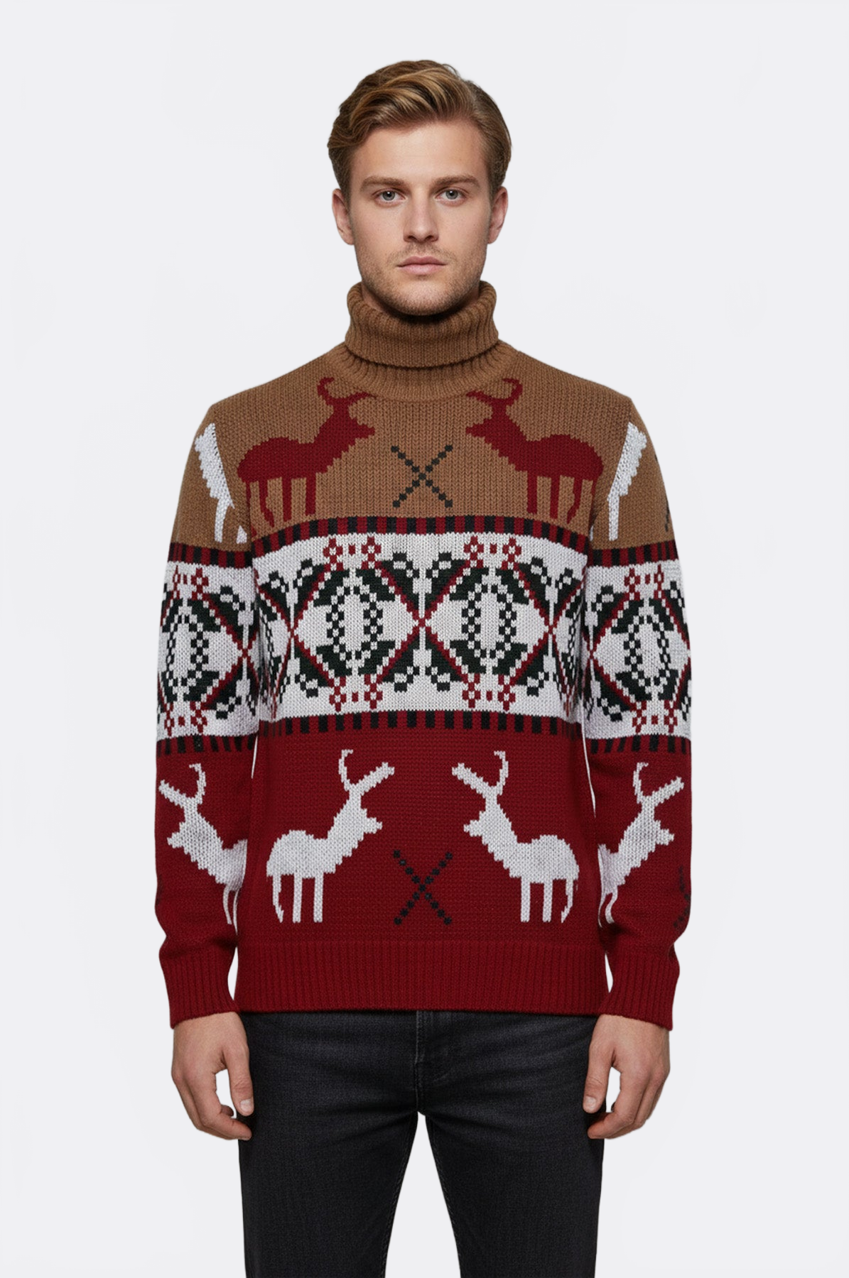 Maglione da uomo rosso beige con dolcevita a tema natalizio con motivo cervo - Wessi