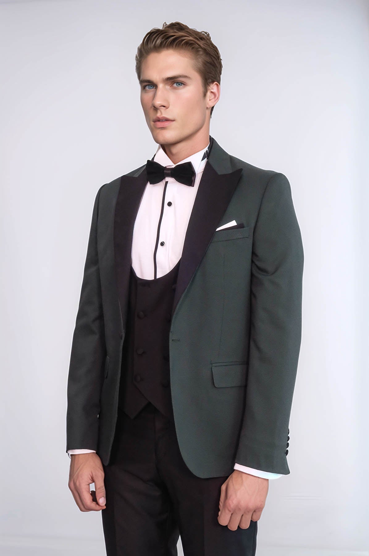 Si tratta di una giacca da abito prodotta in colore verde, bottone singolo, doppio spacco, tre tasche e modello slim fit. Questa giacca con motivo a pois ha il colletto a punta. Il colletto è disegnato in nero. All'interno c'è un gilet semplice, nero, slim fit con gilet doppiopetto. Questo completo completa la combinazione di pantaloni dritti in tessuto di colore nero dalla vestibilità comoda. Questo modello di abito a tre pezzi è un prodotto molto elegante.