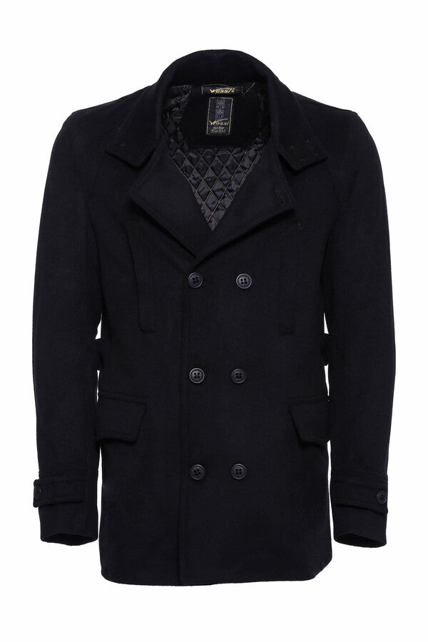 Si tratta di un modello di cappotto da uomo a quattro tasche multibottoni dominato da tessuto cashmere di colore nero con spalline sulle braccia. Questo modello, che si differenzia dai modelli di cappotto cachet standard per la sua forma a doppio petto, attira l'attenzione con il suo aspetto moderno. Questo cappotto di colore nero è realizzato in tessuto di cashmere. Mentre il tessuto in cashmere non lascia entrare l'aria fredda dall'esterno, non lascia uscire l'aria calda dall'interno. Questo modello a quattro tasche ha il colletto dominante. Le spalline sulle maniche rendono questo modello più mobile e diverso. Con la sua struttura slim fit, questo cappotto corto si adatta meglio al tuo corpo.
