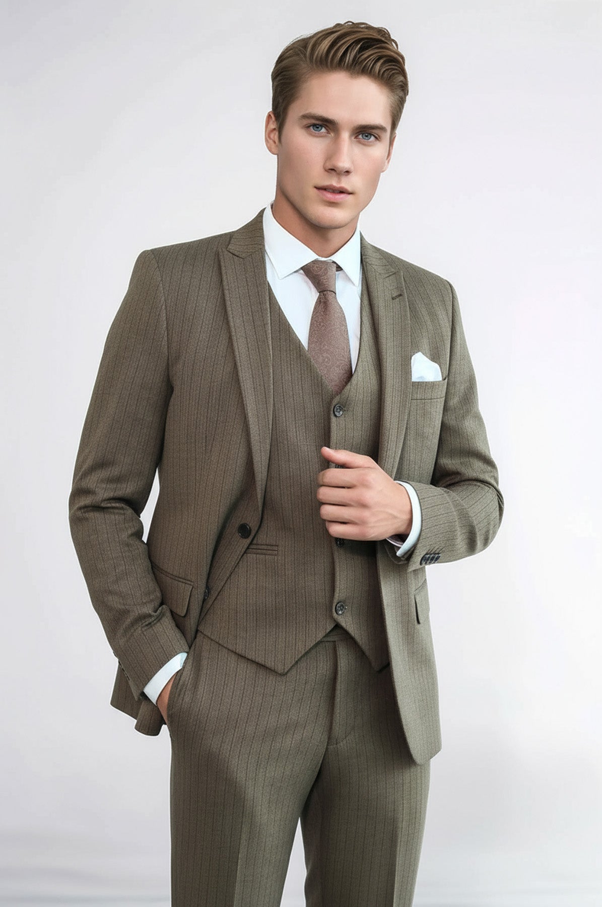 Che tu stia andando in ufficio o a un evento aziendale, questo abito farà sicuramente girare la testa e ti farà sembrare il capo supremo! Questo abito marrone con motivo a righe è proprio ciò di cui hai bisogno! Questo completo è perfetto per riunioni di lavoro, conferenze e per impressionare i clienti. Con la sua vestibilità slim e il revers a punta, trasuda sicurezza e stile. Per completare il tuo look, abbina questo abito ad una camicia bianca o nera e una cravatta complementare. Aggiungi un paio di scarpe lucide e un orologio elegante per completare l'insieme. Che tu stia cercando un look formale o casual da lavoro, questo abito può essere abbinato a qualsiasi occasione. Il motivo a righe sull'abito aggiunge un tocco di eleganza e classe, mentre il colore marrone gli conferisce un tocco moderno. Questo abito è perfetto per gli uomini che vogliono distinguersi e fare una dichiarazione con le loro scelte di moda.