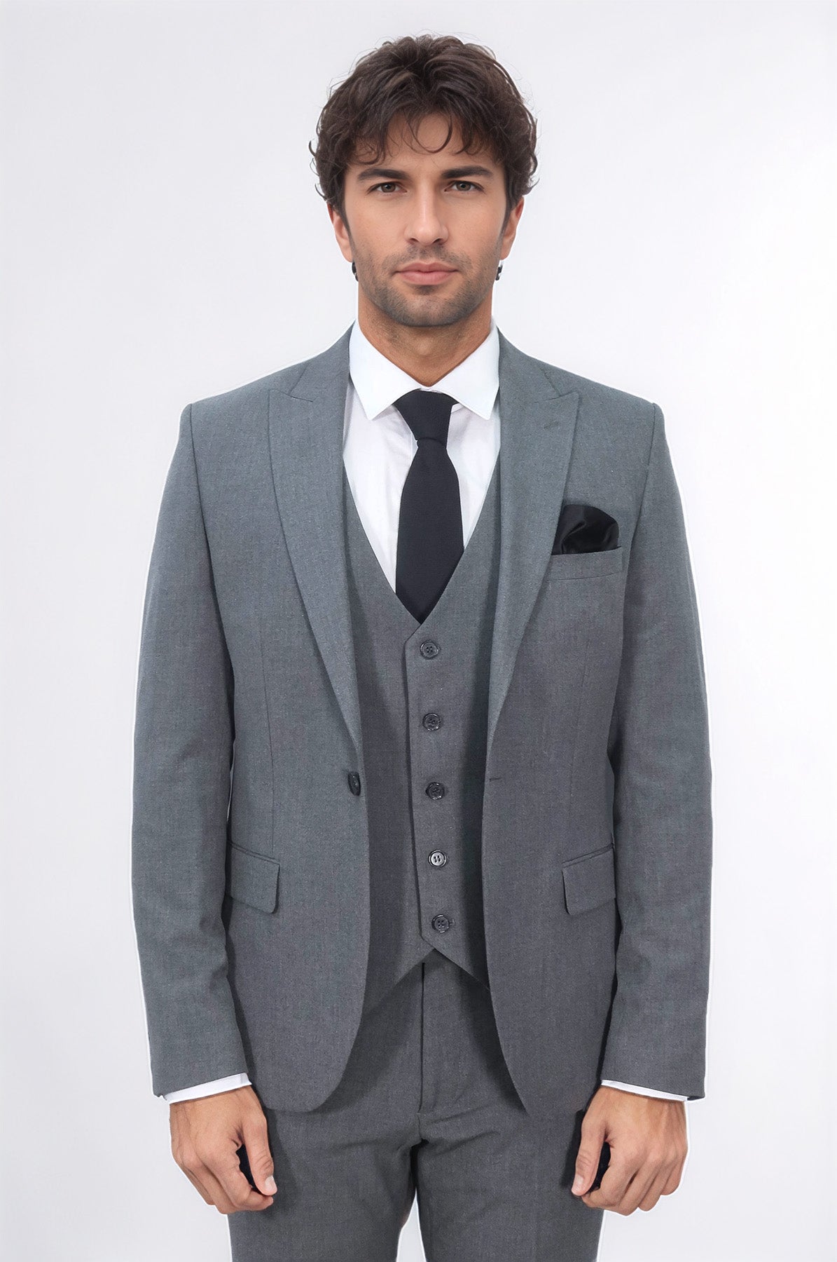 Questo abito da uomo a tre pezzi dalla vestibilità slim in un elegante colore grigio è perfetto per ogni occasione formale. Con un design elegante e moderno a bottone singolo, questo abito farà sicuramente una dichiarazione. Realizzato con materiali di alta qualità, offre una vestibilità comoda e su misura. Aggiorna il tuo guardaroba con questo abito sofisticato e versatile.