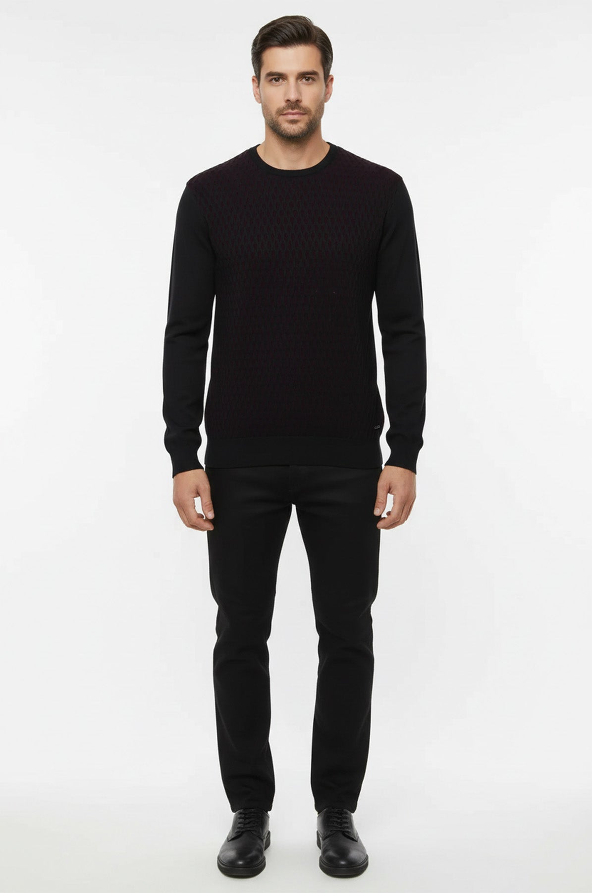 Circle neck mens sweater, designed with diamond patterned on chest in black.