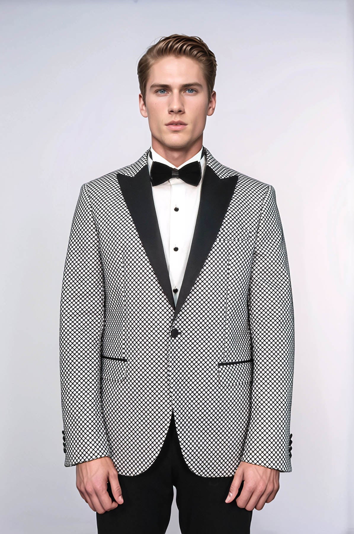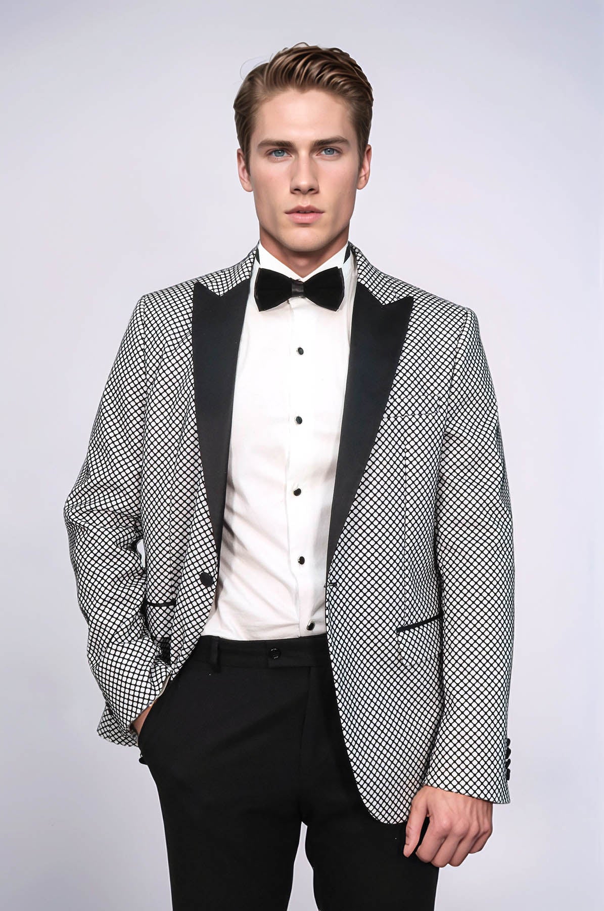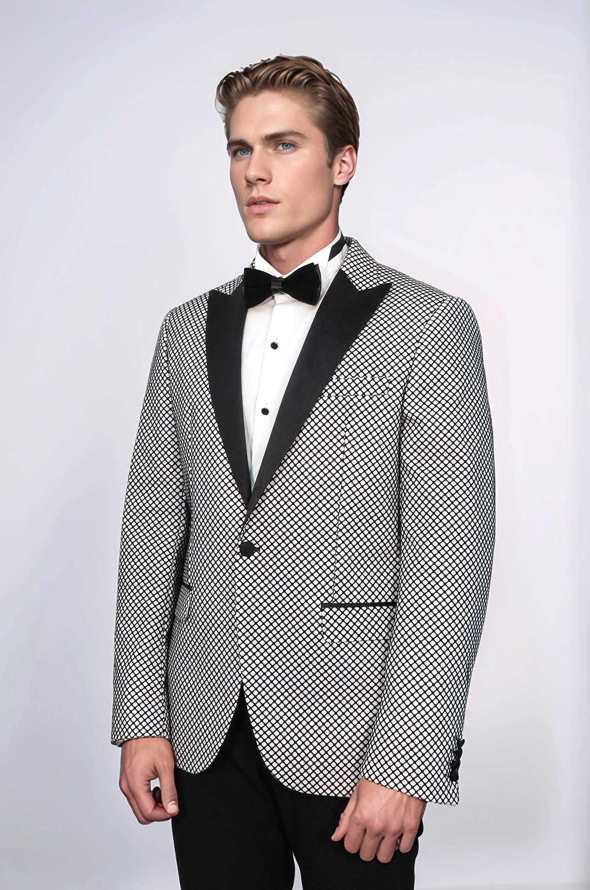 Sophisticated, elegant, and distinctive — Wessi's black patterned over white men party blazer delivers refined elegance with expert tailoring. This refined tuxedo blazer features a crisp white color with striking black patterns, single button closure, and peak lapel that creates a sleek and modern appearance, perfect for prom, formal events, cocktail parties, weddings, galas, graduation ceremonies, special celebrations, and making a powerful statement with contemporary sophistication.
