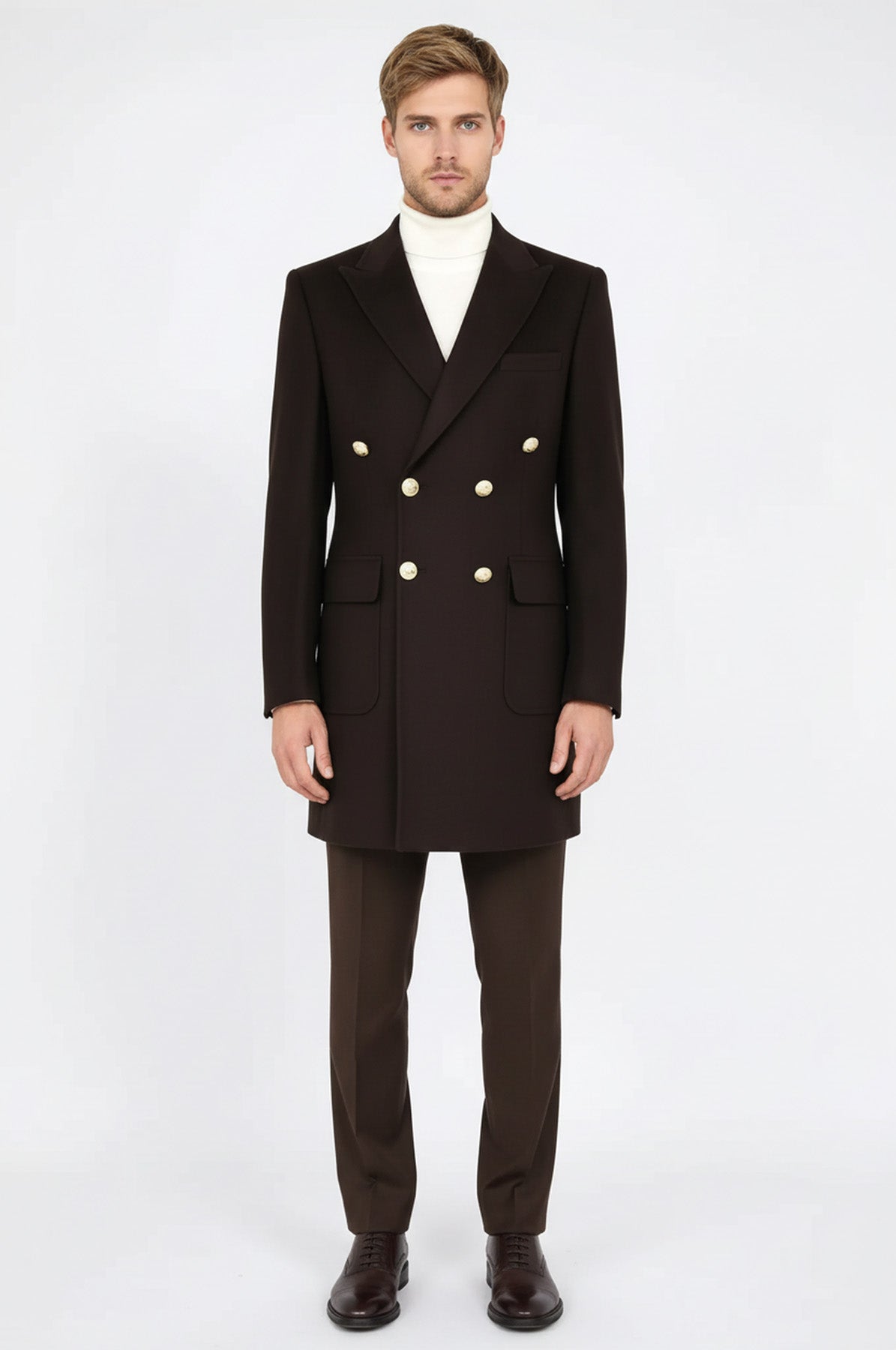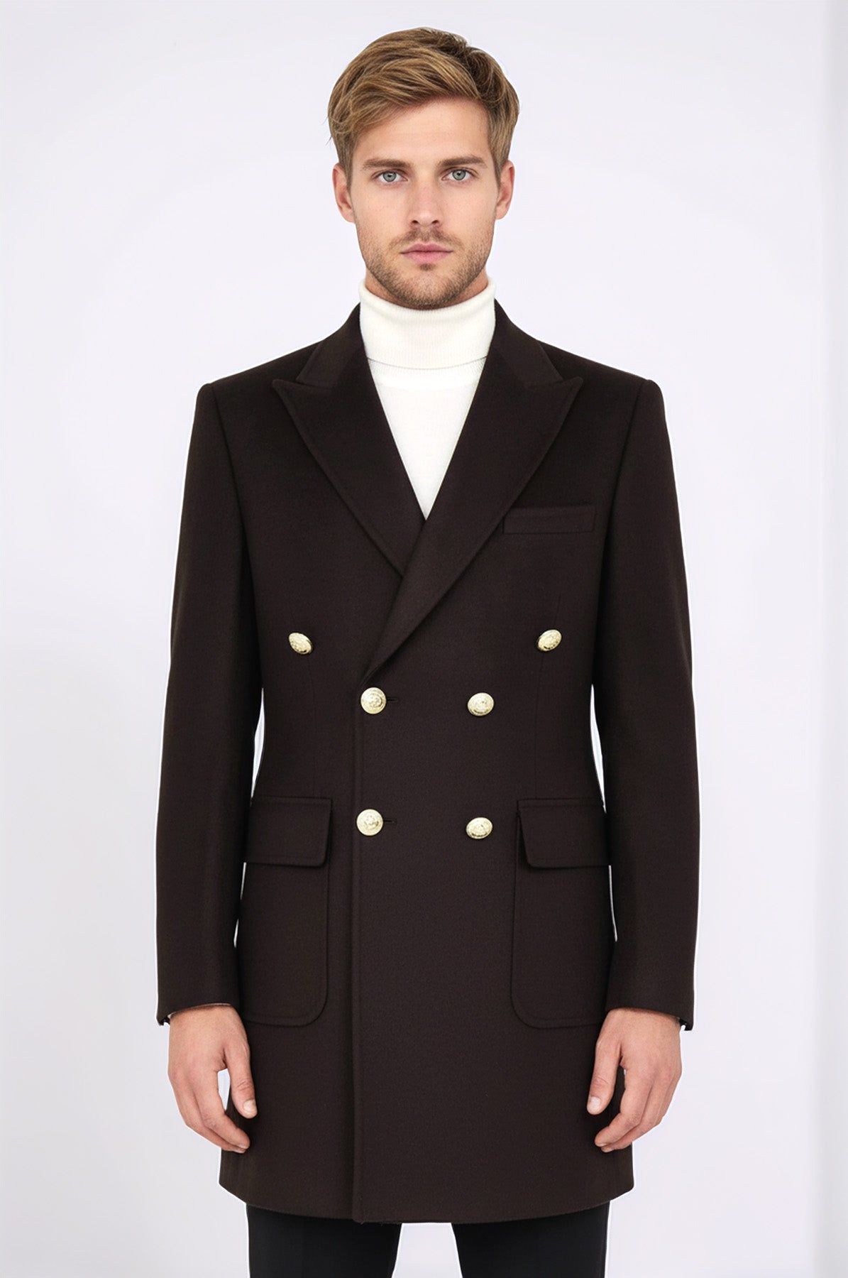Brown Metal Buttoned Double Breasted Long Coat - Wessi