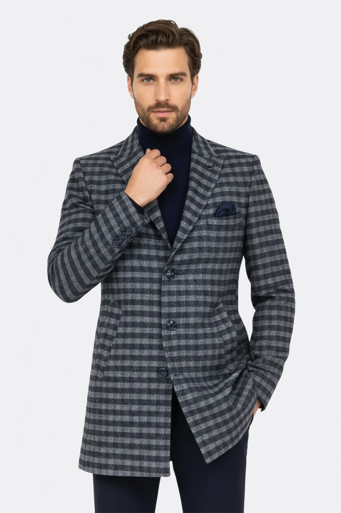 Step into the world of effortless sophistication with our irresistible men's slim fit plaid cachet coat in a mesmerizing navy blue. This coat is the very itself of timeless charm, designed to keep you both warm and stylish during the winter and autumn seasons. Get ready to make heads turn with the wide lapel and slim fit silhouette that accentuate your natural charm. Our plaid cachet coat exudes elegance and chic vibes, ensuring you stand out from the crowd wherever you go. For a classic and refined look, pair the navy blue plaid cachet coat with slim fit grey trousers, a crisp white shirt, and a patterned tie. If you're aiming for a more relaxed yet stylish outfit, team up the coat with dark denim jeans, a cozy sweater, and suede ankle boots. This combination strikes the perfect balance between casual comfort and suave elegance. Buy this slim fit plaid cachet coat today and unlock the secret to effortless elegance. Its stunning design, luxurious navy blue color, and versatility make it a must-have addition to any fashion-savvy gentleman's wardrobe. Add to your cart now to not the miss opportunuties.