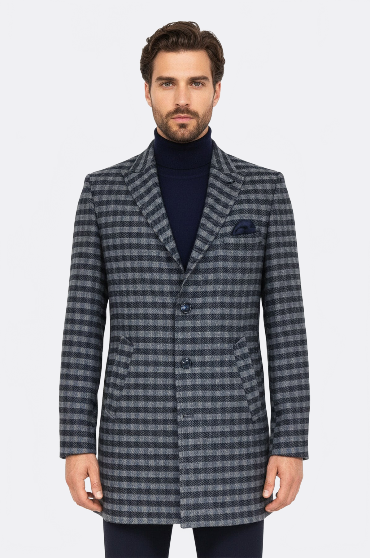 Cachet Plaid Wide Lapel Slim Fit Navy Blue Men Coat - Wessi