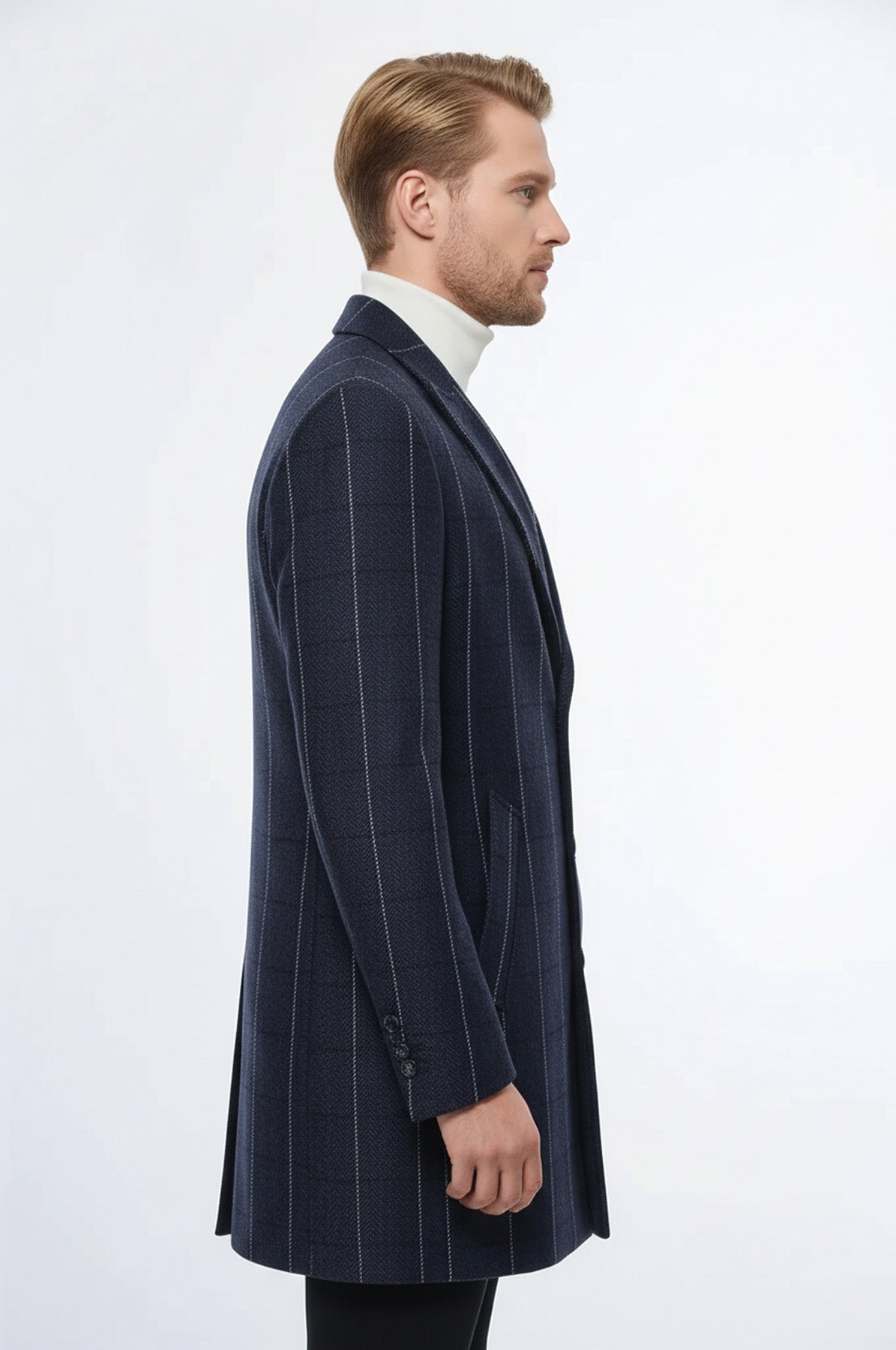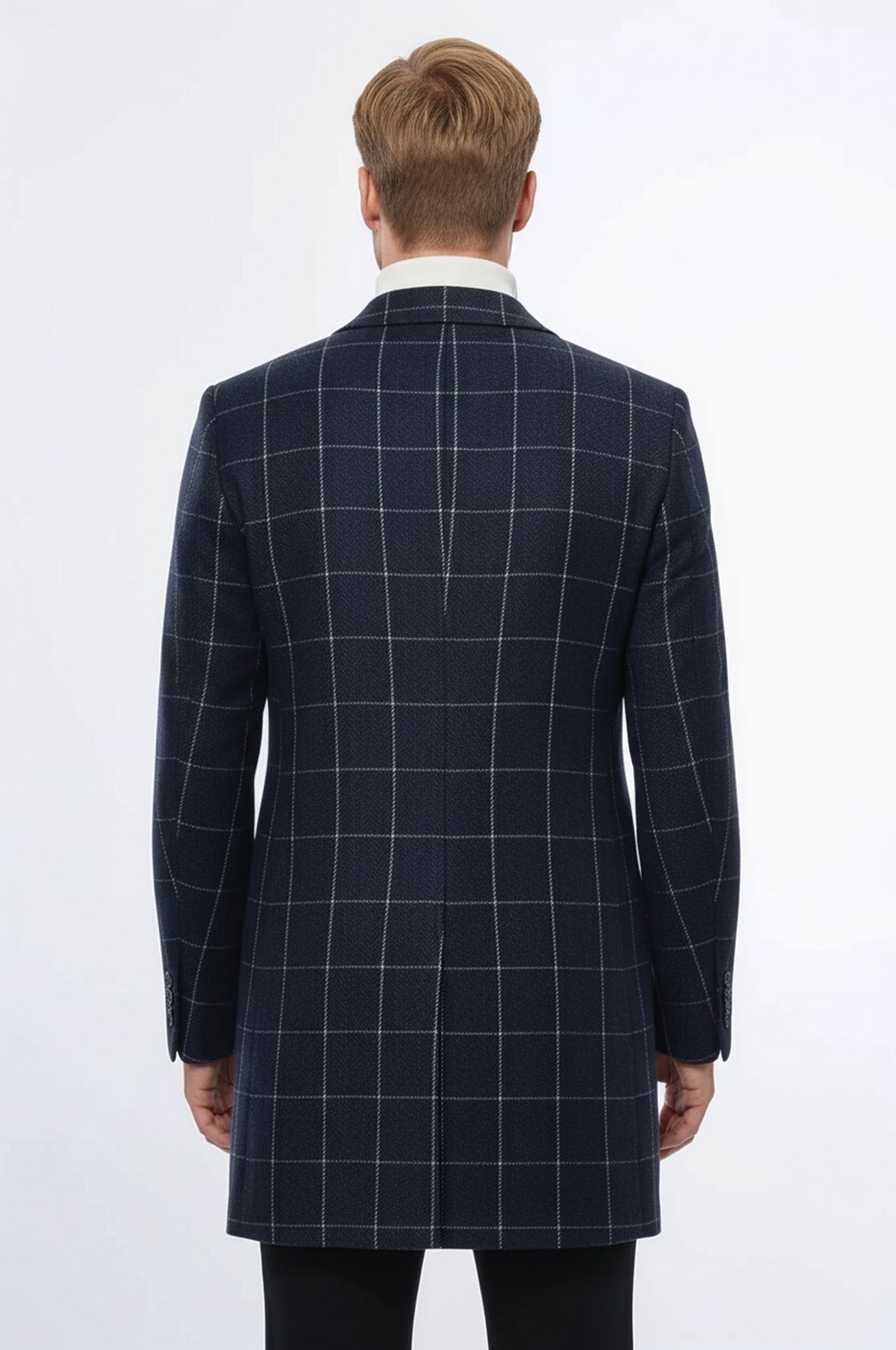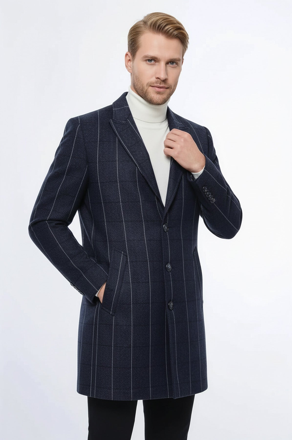 Men's coats are the key to achieving an elegant and sophisticated look. Available in different cuts, lengths and fabrics, these coats complement your style by offering options for every style and special event. Representing a classic and sophisticated style, this navy blue men's coat draws attention with its plaid pattern and wide lapel design. Its three-button and two-pocket design combines both elegance and functionality. This coat is an indispensable piece for the winter season and complements every outfit. You can combine this navy blue coat with a white shirt and a dark colored tie to highlight your elegance. You can complete the outfit by choosing a gray or black slim-fit trousers underneath. You can emphasize your style by wearing black leather oxford shoes or loafers. Consider adding navy blue gloves and a beret for additional protection against cold weather conditions. This outfit is suitable for many different occasions, from business meetings to special events, and offers a classic elegance.