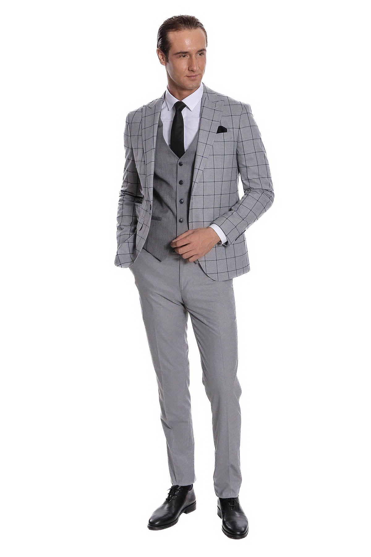 Checked Patterned Slim Fit Grey Men Suit - Wessi