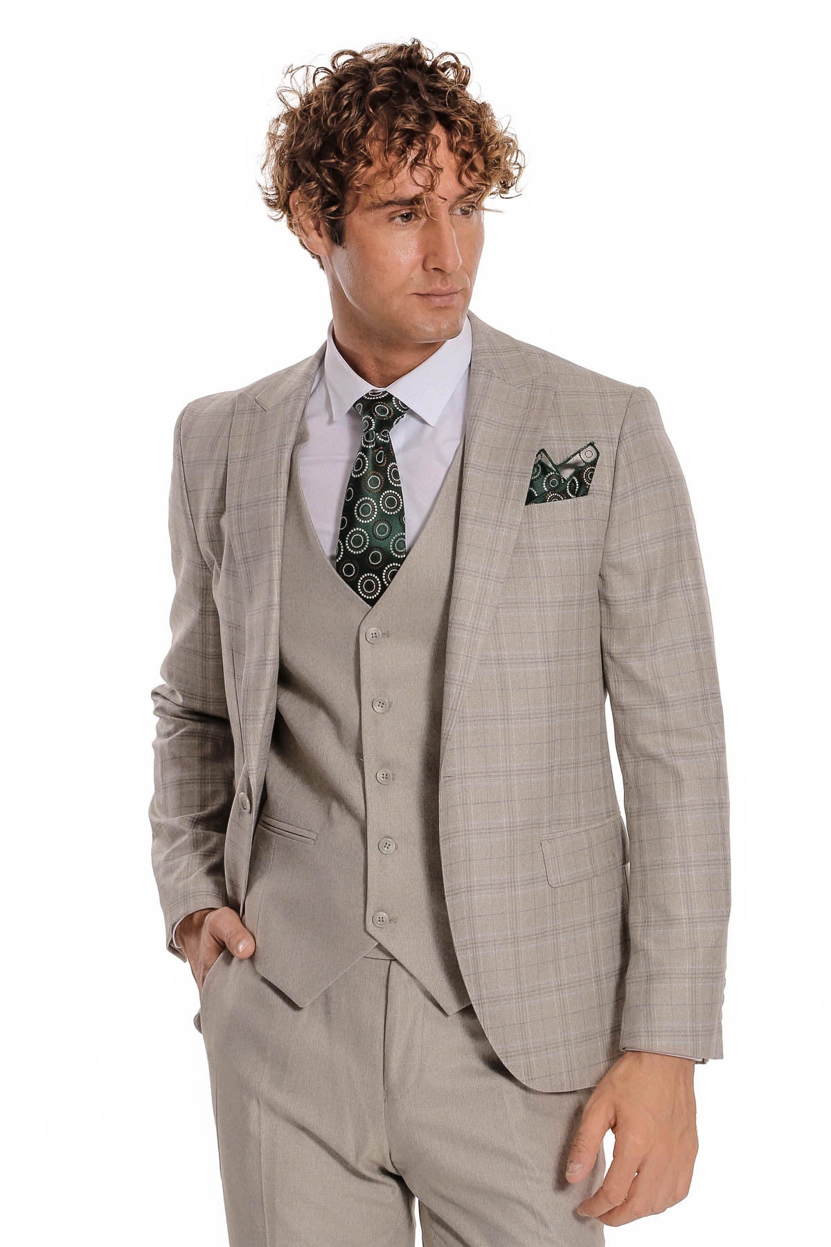 Modern, polished, and stylish — Wessi's cream checked 3-piece suit with patterned vest delivers sophisticated elegance with expert tailoring. This complete suit set includes a checked blazer, patterned vest, and patterned trousers, featuring a refined cream color with plaid pattern that adds texture and dimension to any outfit for a professional and stylish appearance.