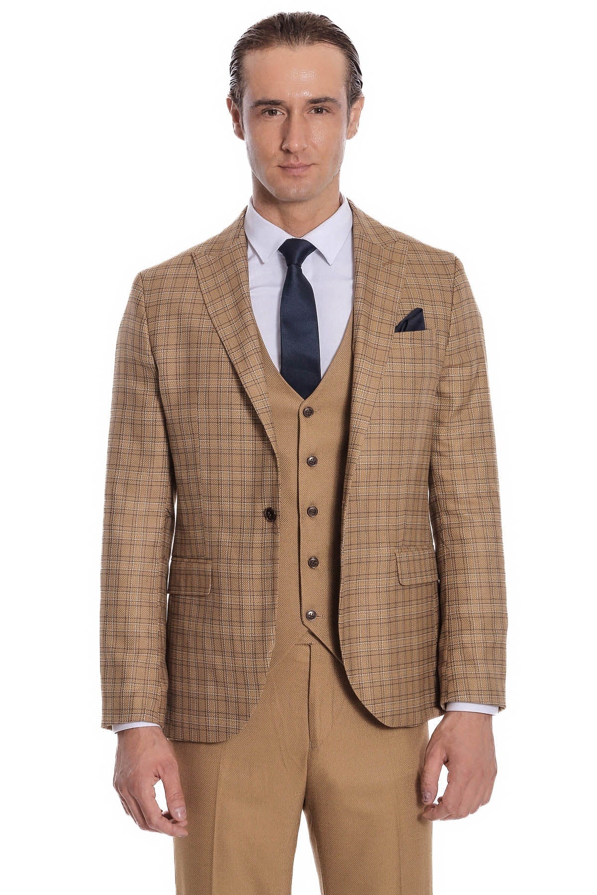 Versatile, warm, and stylish — Wessi's tan checked 3-piece suit with patterned vest delivers sophisticated elegance with expert tailoring. This complete suit set includes a checked blazer, patterned vest, and patterned trousers, featuring a refined tan color with checked pattern that's a great alternative to traditional black or navy suits, adding personality to your wardrobe for a variety of settings and occasions.