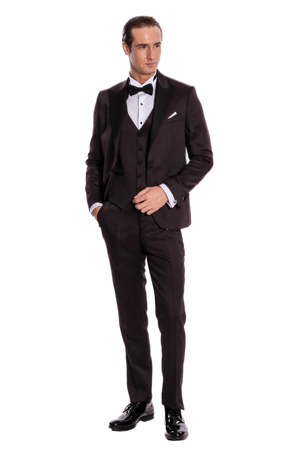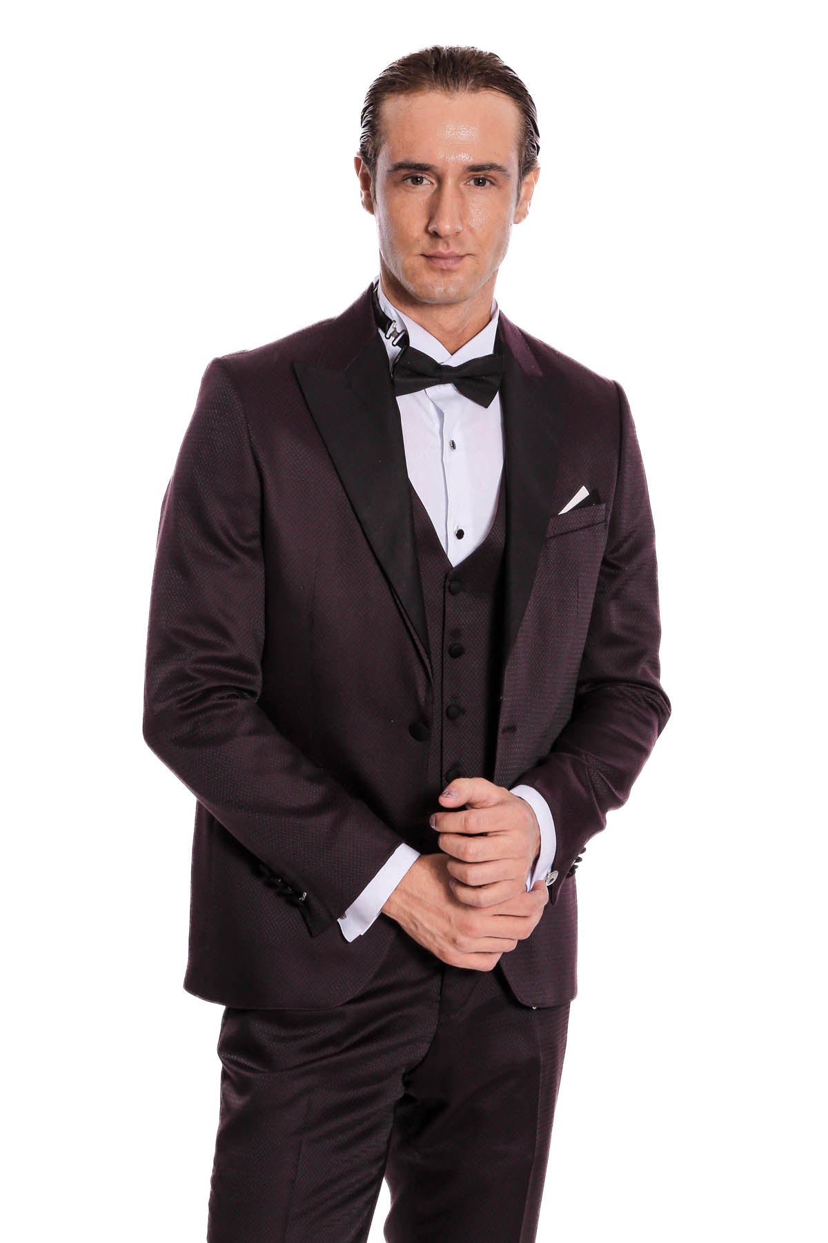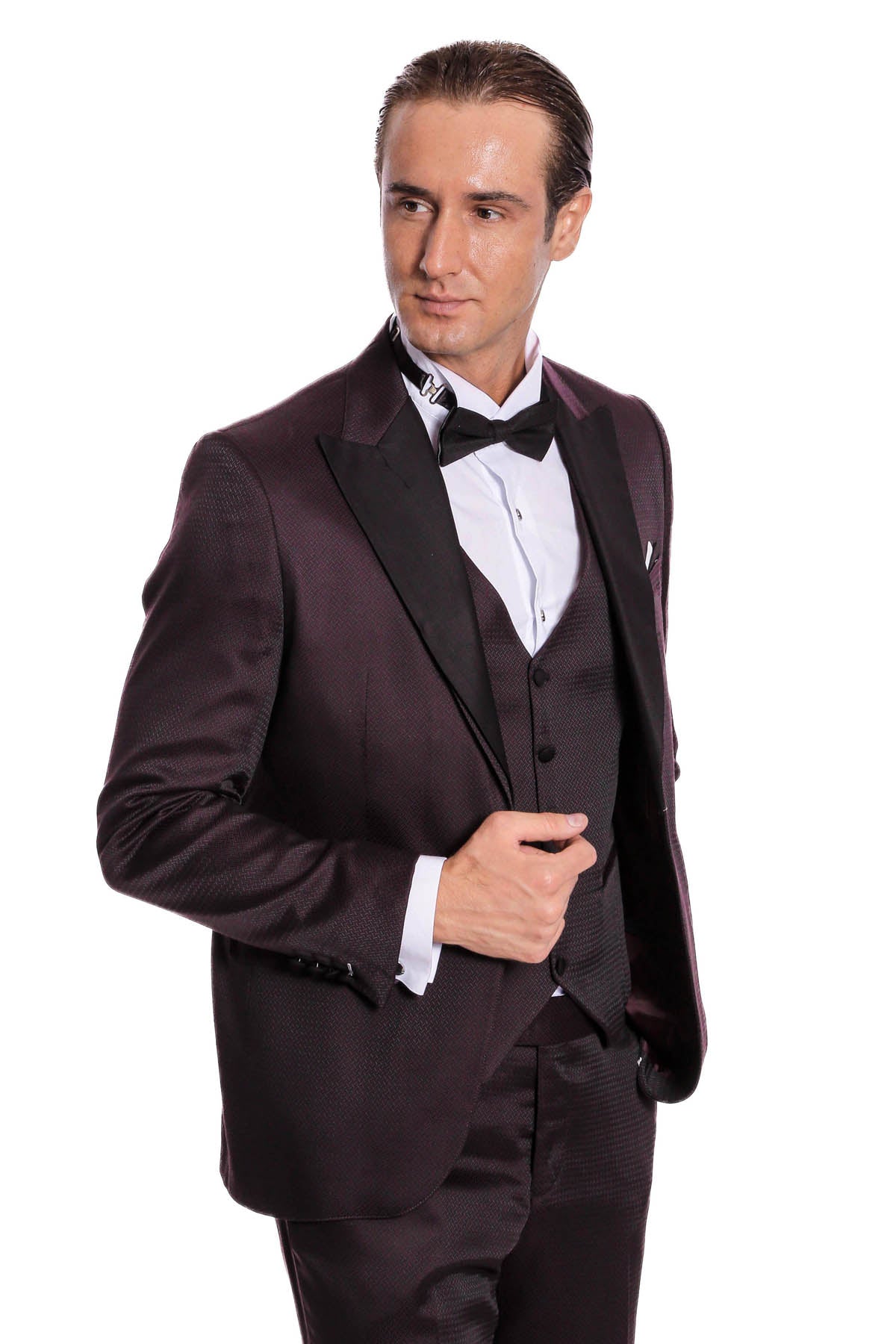 The suit model, produced with bright black colored polyvison fabric, offers a very nice look. It is a groom suit model decorated with dotted pattern consisting of pants, vest and jacket. It has three pockets and two slits. It has a wide pointed collar. It has a very elegant vest with a V-neck dot pattern. Vest and jacket models with slim fit pattern will suit you well. It is a dotted pattern, black color and slim fit trousers.