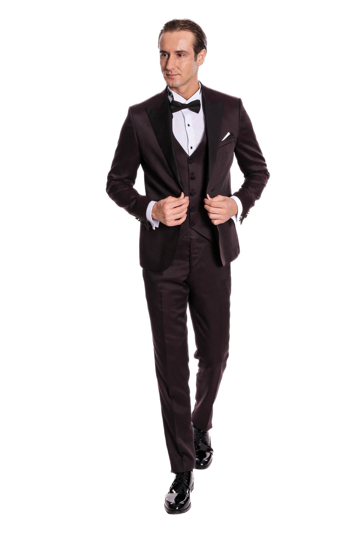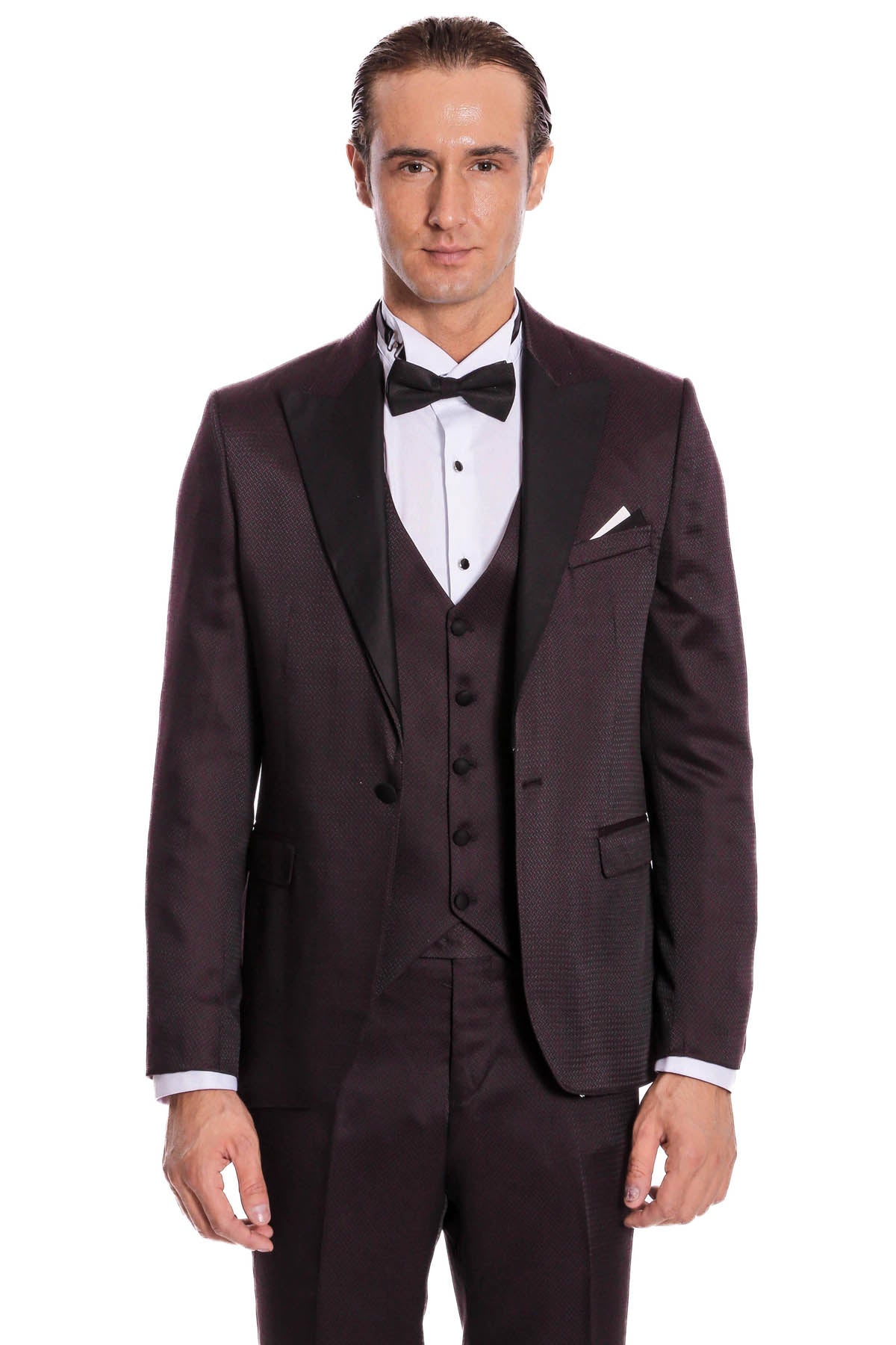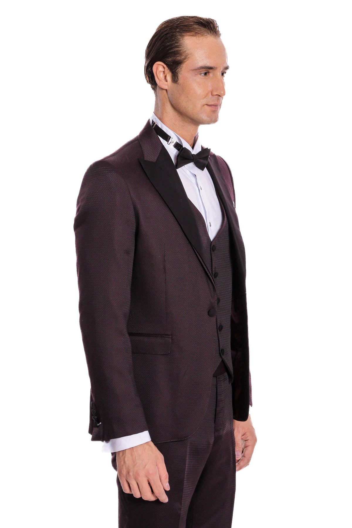 The suit model, produced with bright black colored polyvison fabric, offers a very nice look. It is a groom suit model decorated with dotted pattern consisting of pants, vest and jacket. It has three pockets and two slits. It has a wide pointed collar. It has a very elegant vest with a V-neck dot pattern. Vest and jacket models with slim fit pattern will suit you well. It is a dotted pattern, black color and slim fit trousers.