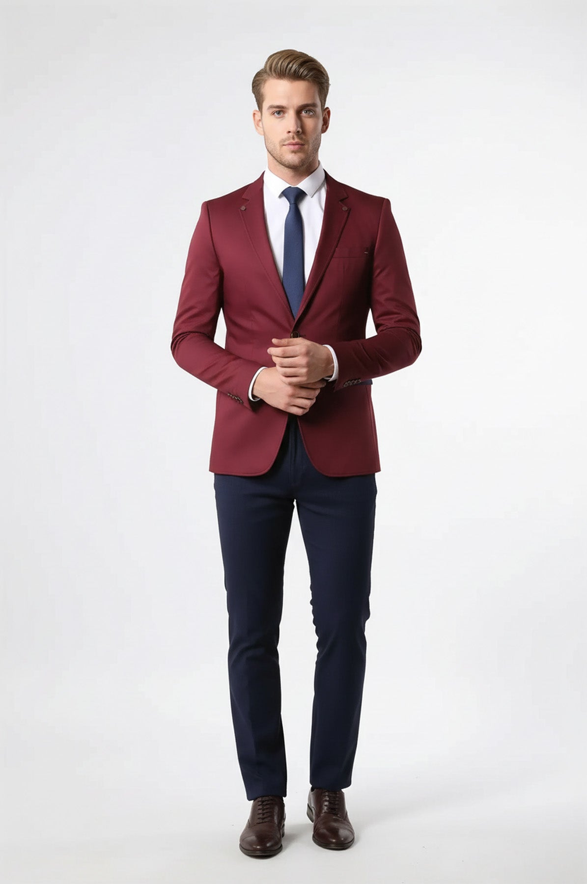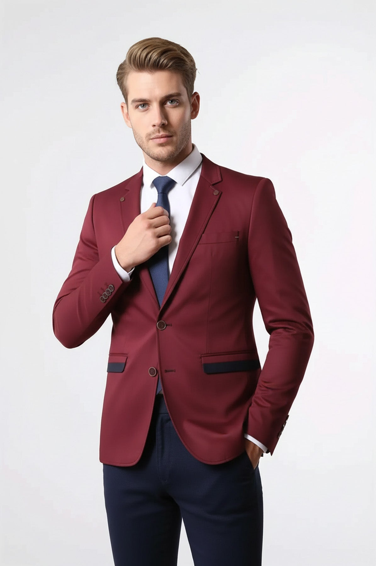 Sophisticated, distinctive, and stylish — Wessi's crew neck burgundy men blazer delivers contemporary elegance with expert tailoring. This refined blazer features a rich burgundy color with unique crew neck design, modern silhouette, and premium fabric that creates a sleek and polished appearance, perfect for casual business settings, smart casual occasions, office wear, weekend outings, social gatherings, and adding a touch of sophistication to any outfit.
