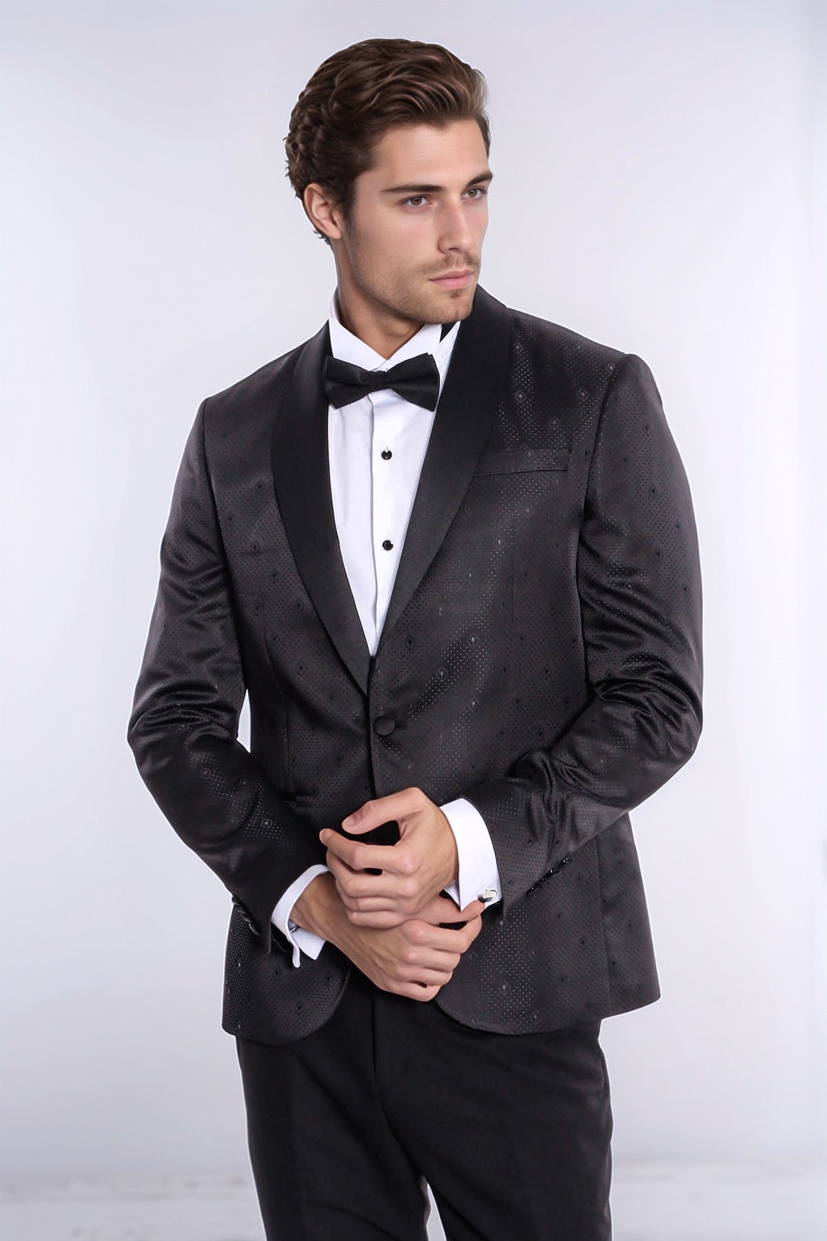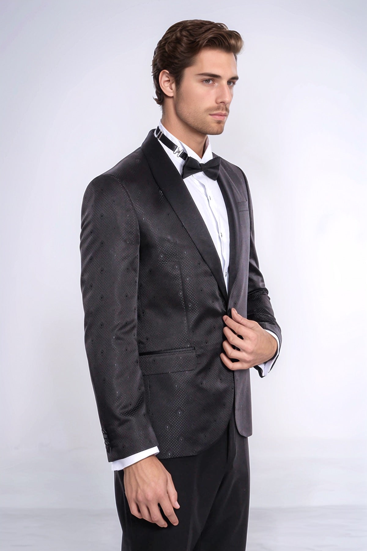 Sophisticated, elegant, and distinctive — Wessi's dot patterned slim fit black men tuxedo jacket delivers refined elegance with expert tailoring. This refined blazer features a classic black color with unique dot pattern, luxurious shawl lapel design, and single button closure that creates a sleek and sophisticated appearance, perfect for prom, graduation ceremonies, weddings, cocktail parties, formal events, stage performances, evening gatherings, special celebrations, and making a powerful statement with contemporary sophistication.