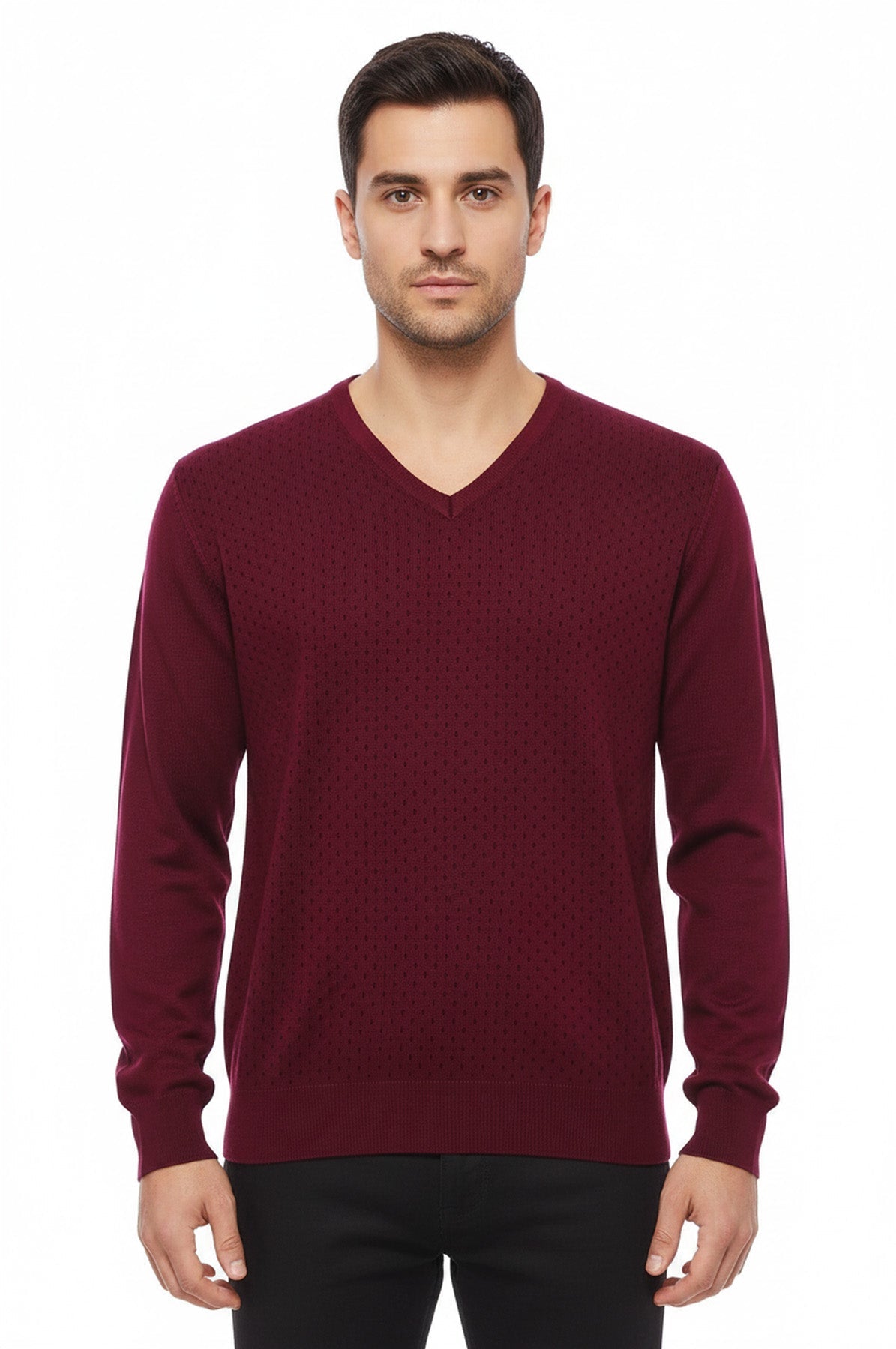 Expertly designed by Wessi, this Dot Patterned V Neck Burgundy Sweater not only adds a stylish element to your wardrobe, but also provides a classic and comfortable fit. With its intricate dot pattern and flattering v-neck, this sweater is perfect for any occasion.