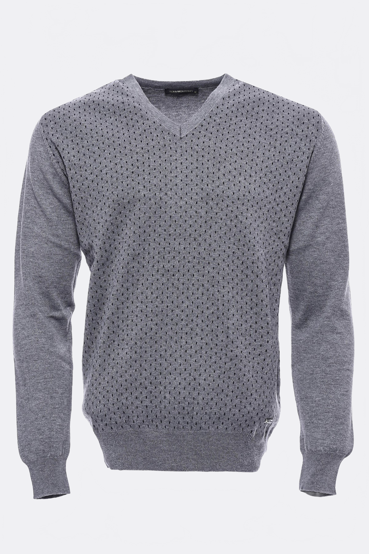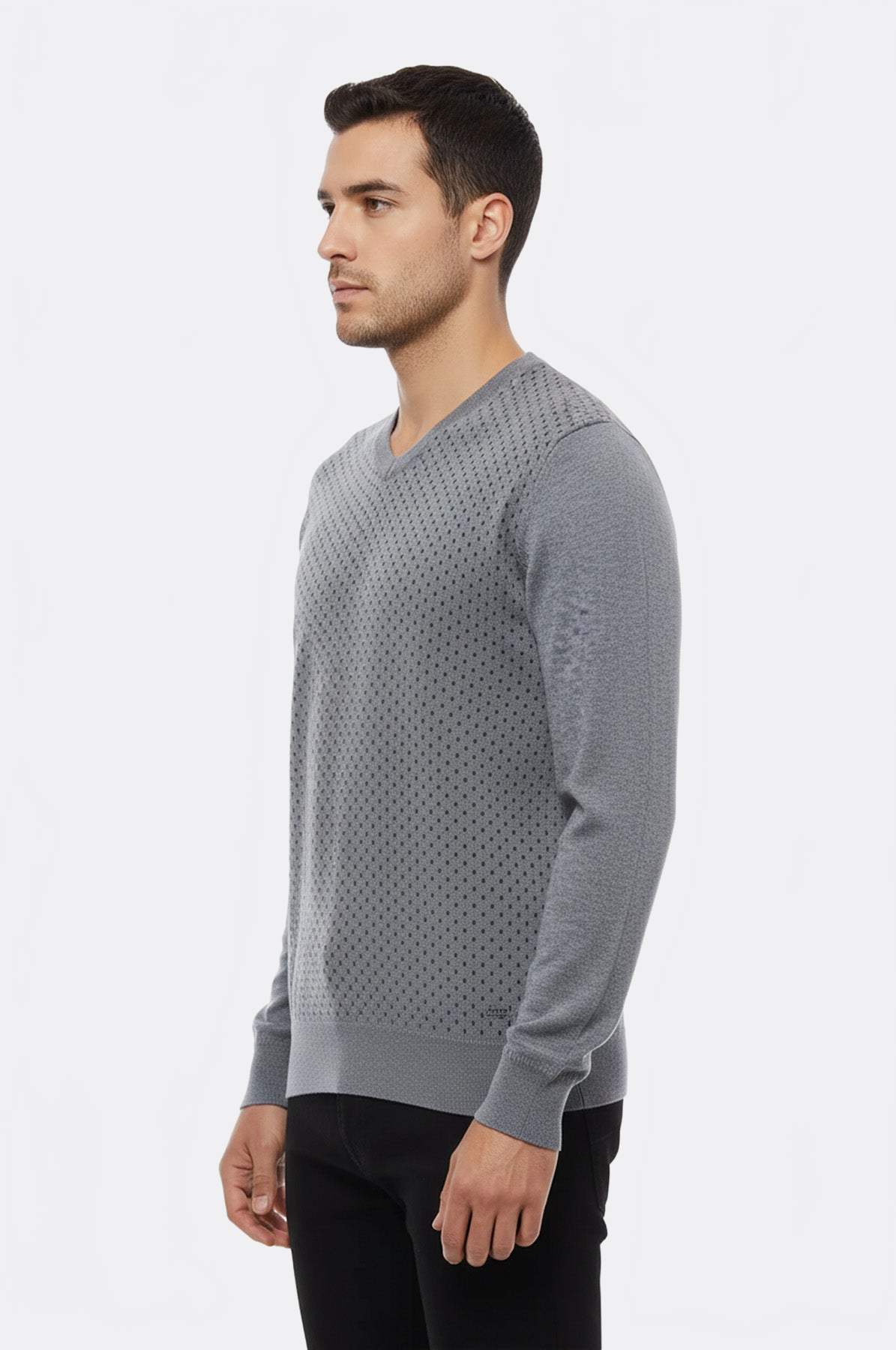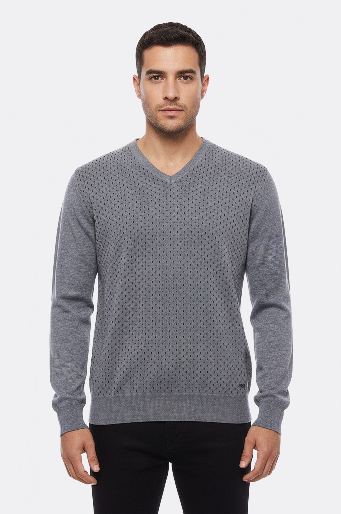 V neck mens sweater, designed dot patterned on chest in grey.