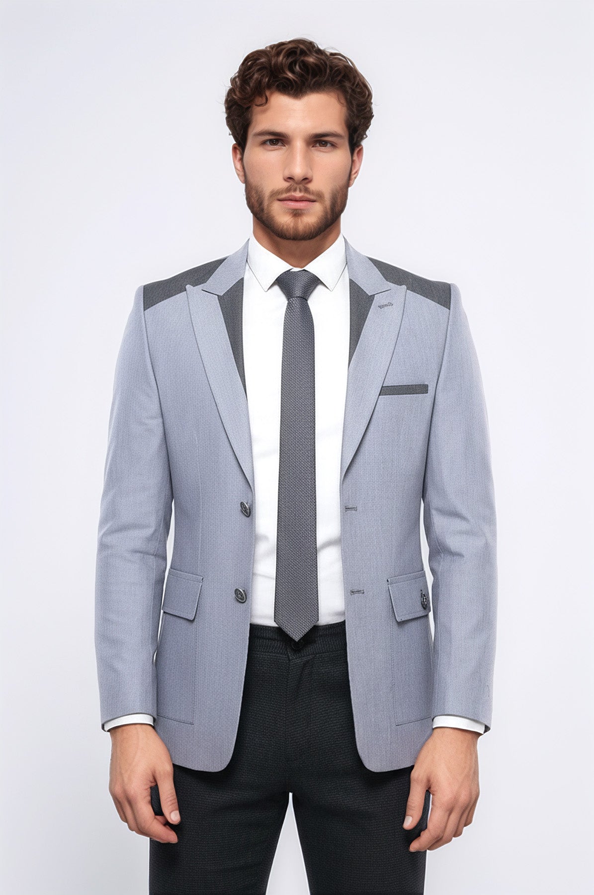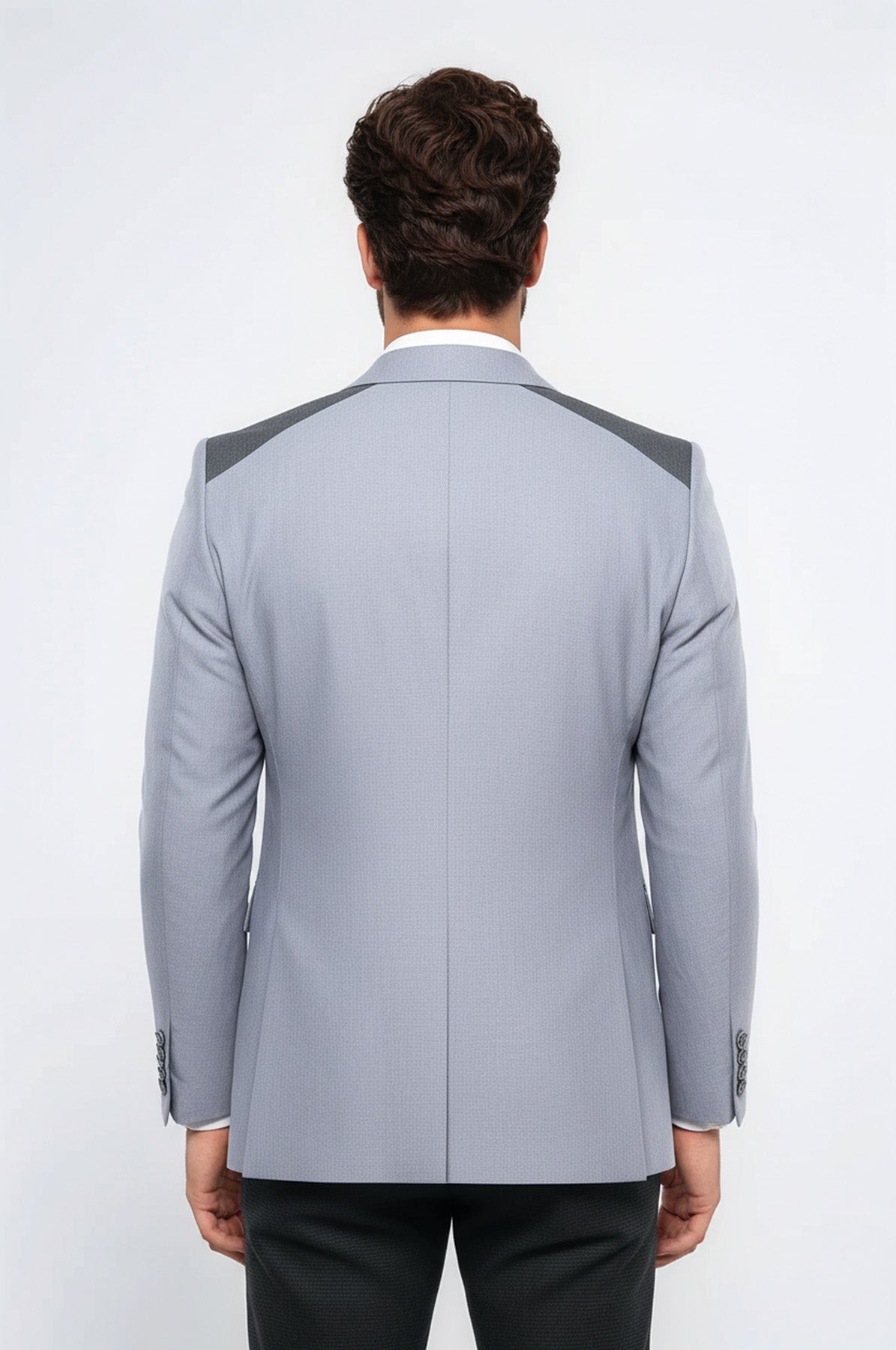 A: Its light grey fabric combined with contrasting dark details on the collar and shoulders adds a modern, distinctive touch.
