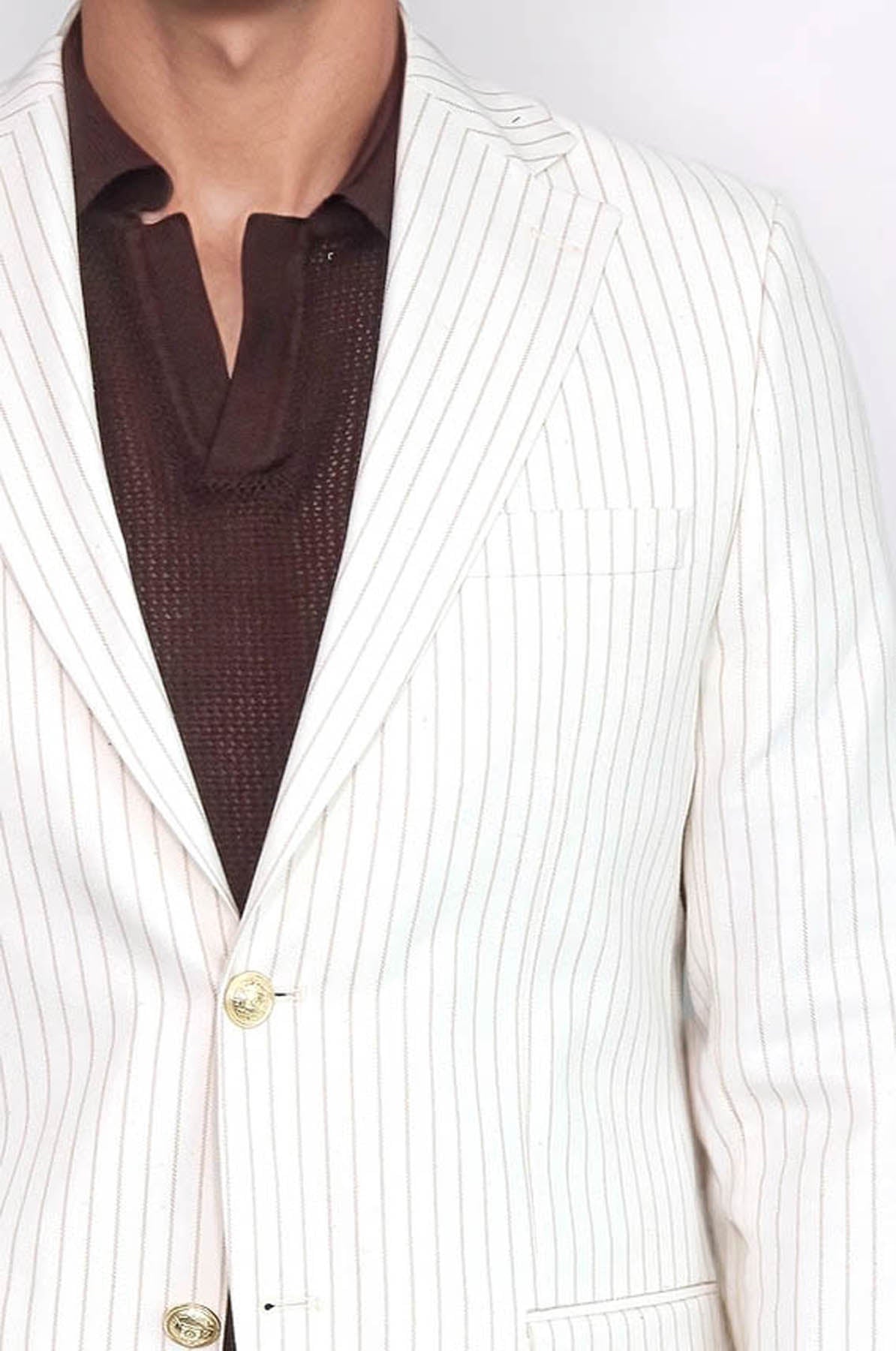 Ecru Striped Linen Gold Metal Button Slim Fit Men's Blazer Jacket - Wessi
