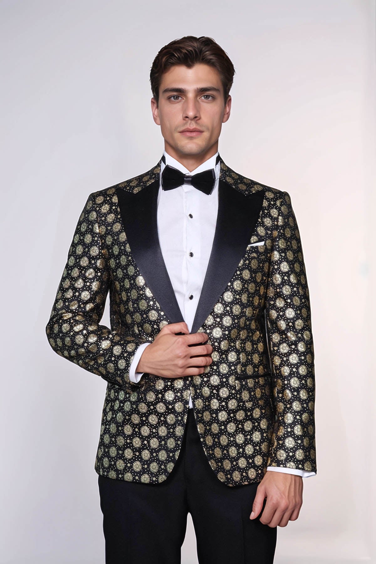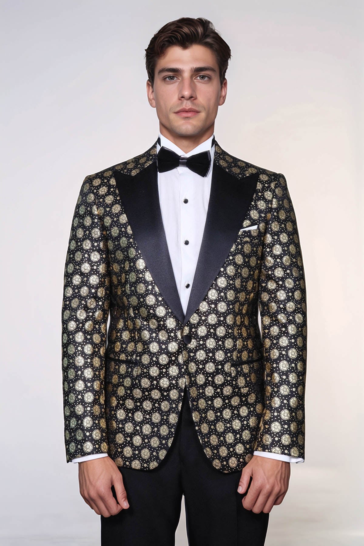 This elegant Floral Patterned Dinner Jacket by Wessi features a unique gold embellished design on a classic black background. With a stylish peak lapel, this jacket is perfect for formal occasions and adds a touch of sophistication to any outfit. Made with high-quality materials, it is sure to impress.