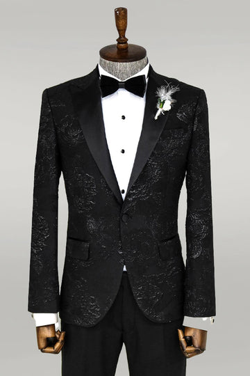 Floral Patterned Peak Lapel Black Tuxedo Blazer - Wessi