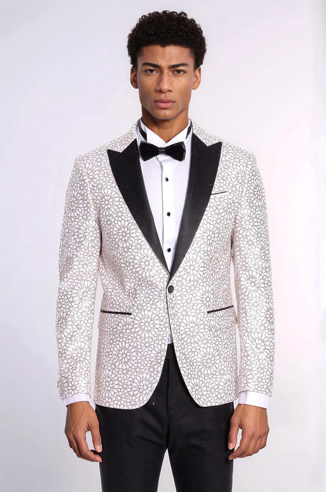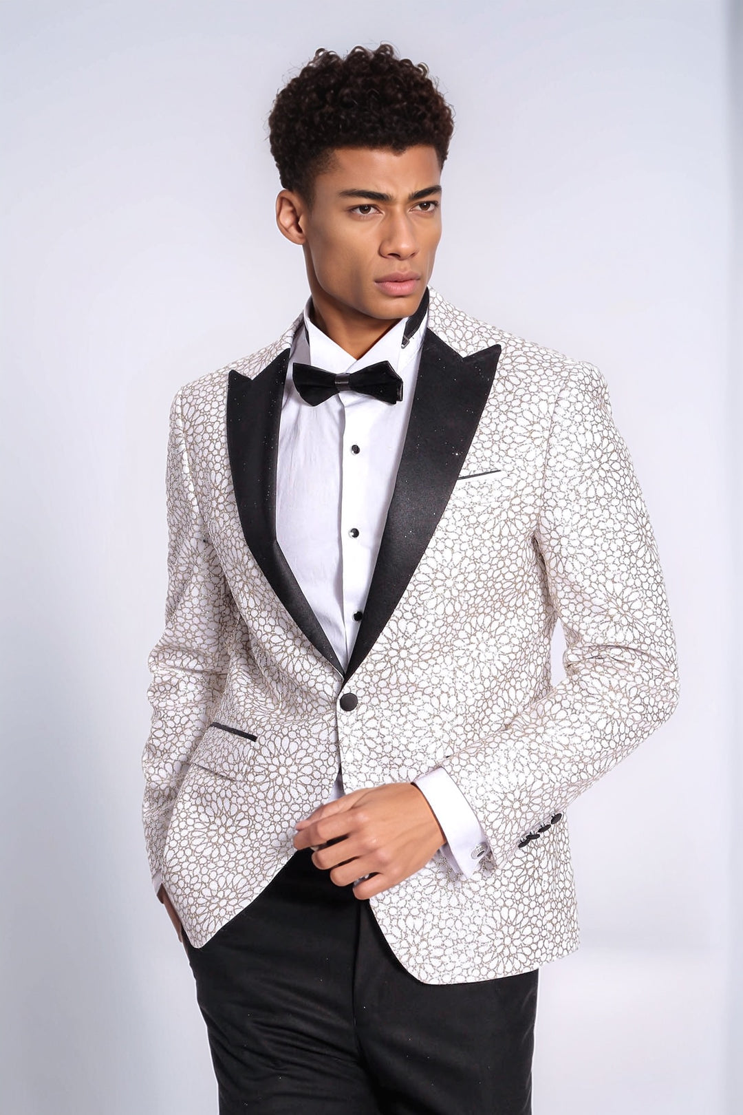 Flower Embroidered Pattern White Men Wedding Tuxedo Jacket - Wessi