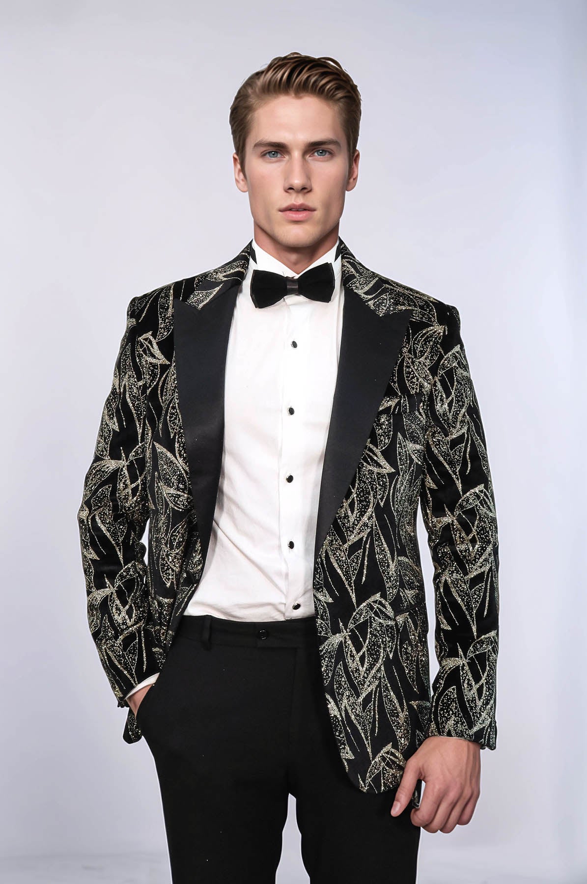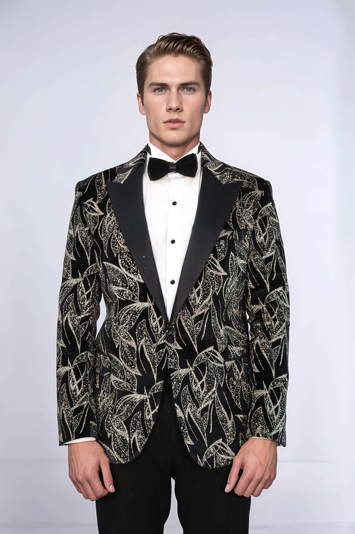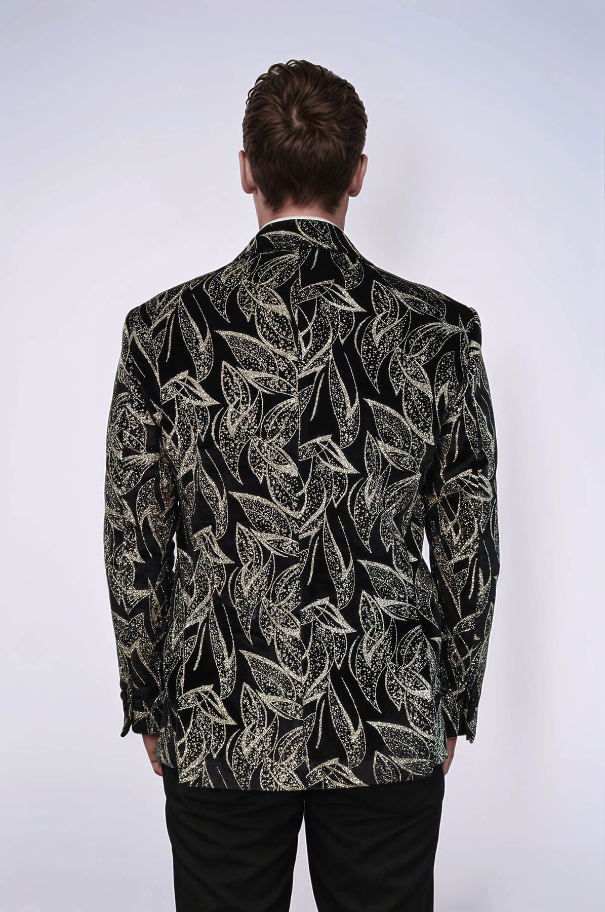 Make a bold enterance at your next formal event with our slim fit, glittery black prom blazer. Crafted from high-quality materials, this blazer is designed to add a touch of glamour and sophistication to any outfit, whether you're attending a wedding, special occasion, party night, or celebration. The slim fit silhouette is both modern and flattering, while the glittery black fabric adds just the high amount of sparkle and shine to your ensemble. Our expert stylists recommend pairing this blazer with a crisp white dress shirt, slim-fit black pants, and black dress shoes for a classic, sophisticated look. Invest in your style and elevate your formalwear game with our slim fit, glittery black prom blazer today.