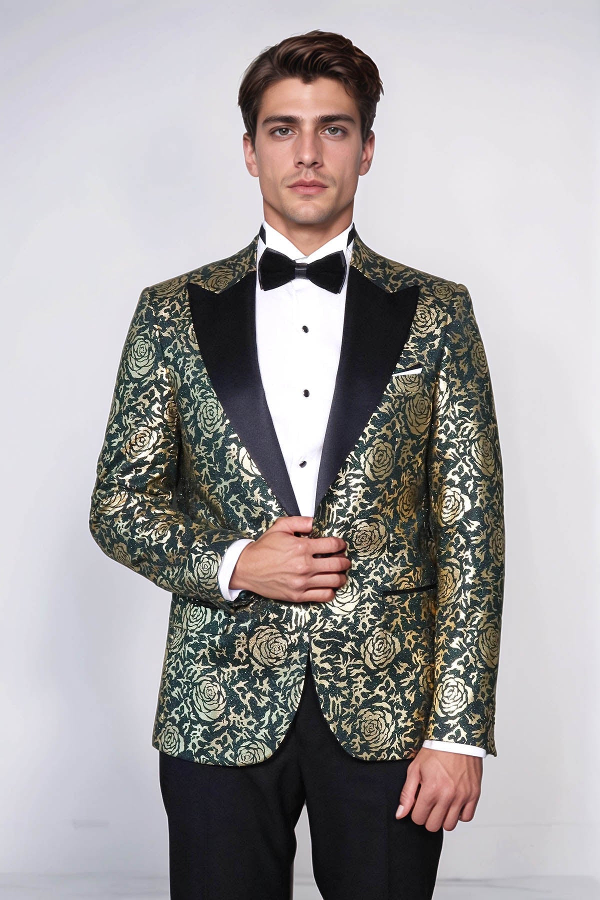 Indulge in luxury with the Gold Rose Patterned Slim Fit Green Men Singer Tuxedo Jacket from Wessi. This exquisite piece features a stunning gold rose pattern, tailored slim fit, and rich green hue. Perfect for any occasion, elevate your style with this exclusive and sophisticated jacket.