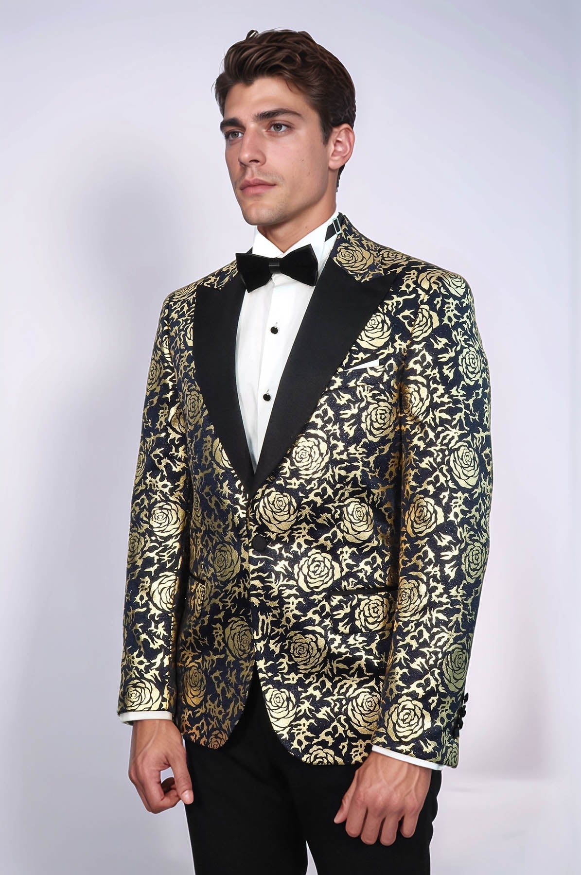 If you're looking to stand out from the crowd at your next special occasion, then look no further than this unique men's prom blazer. With its gold and rose patterns and peak lapel, this navy blue tuxedo blazer is perfect for any night event or wedding! Whether it's a groom's suit or an outfit for other special occasions, you'll be sure to make a lasting impression with its slim-fit style that exudes high fashion. Look your best on special occasions such as weddings and night events with this unique style men's prom blazer. Its slim fit design is tailored to fit the contours of your body perfectly while providing an elegant look.