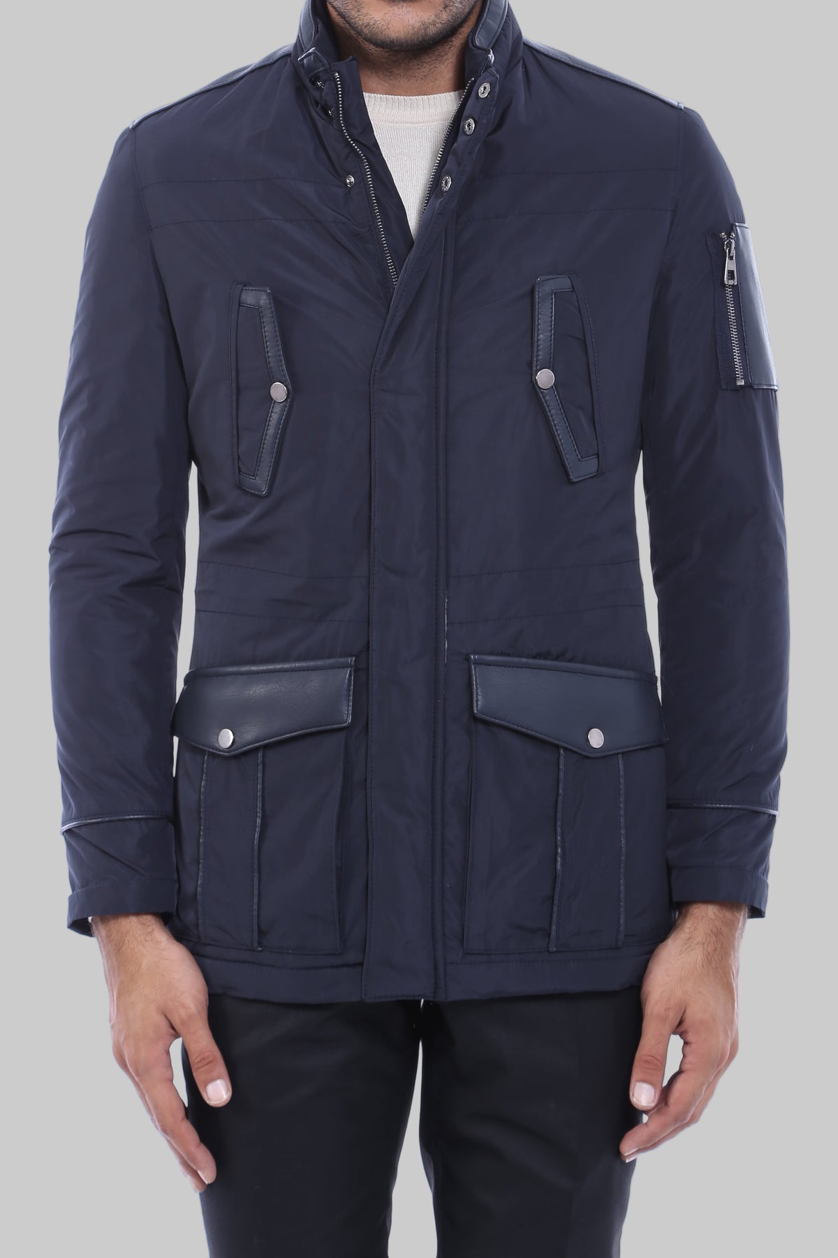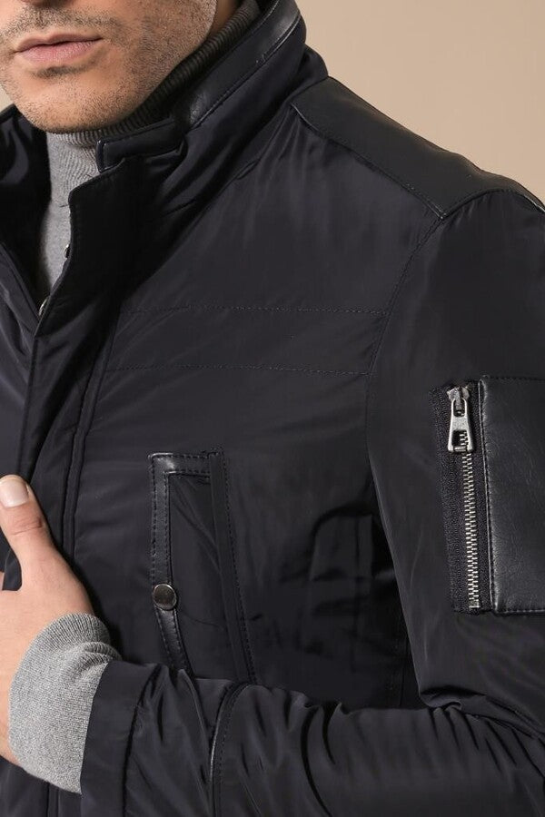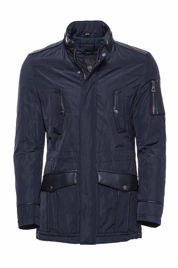 Composed of polyester and viscose blend fabric, this men's coat is dark blue. It has four pockets. It offers a stylish and cool look with leather fabric in sleeves and pockets. You can create a different look on your body with internally tied waist detail. It differs from other coats with its steep collar. The upright collar model is designed to minimize heat loss and to look stylish. You can use it easily in any environment with this coat.